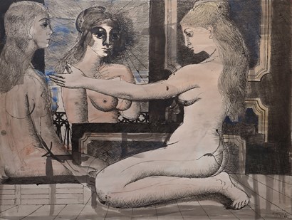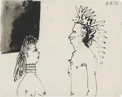 Pablo Picasso (Malaga 1881-1973 Mougins) Two characters, séduction, 1953 Produced in Cannes on 16 December 1953 Ink on paper 20.9 x 26.4 cm Signed upper left and dated upper right Provenance: Scheffel Gallery, Bad Homburg, Germany; private collection, acquired from the Scheffel Gallery in 1989; private collection; private collection, Paris Literature: Christian Zervos, Pablo Picasso. Œuvres de 1953 à 1955, vol. 16, Paris, 1965, n° 57, p. 20; Dore Ashton, Picasso on Art: A Selection of Views, New York, 1972, p. 125