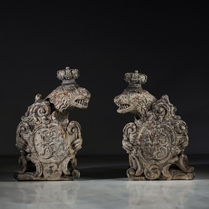 Pair of Carved Heraldic Stone Lions Central European, Hapsburg Territories, late 17th Century Carved limestone H 90 x W 57 x D 77 cm A striking pair of limestone lions, carved in full relief and designed as true opposites. Each is seated upright, with bared teeth, strong haunches and a tightly curled mane. Both wear a crown and hold an oval cartouche carved in bold relief with an interlaced monogram. They were made to flank the formal entrance of a major estate. The form and detailing are typical of high-status Baroque culture in Central Europe and the crown design is especially telling. Each features a repeating pattern of fleur-de-lis and crosses, closely following the design of imperial crowns used in Habsburg heraldry - particularly in the realms of Austria and Bohemia. A crucial distinction is the placement of such a crown directly on the animal - not merely above the cipher - which indicates an emblem of royal standing. Comparable examples can be seen on the monumental lions at Prince Eugene of Savoy's Upper Belvedere Palace in Vienna and others across Bavaria and Austria, where lions were used as heraldic supporters for noble or imperial arms. The monograms are hard to decipher but are almost certainly ciphers for the original owners or patrons. They likely stood at the gates of a major estate or seat of power under Habsburg rule or allegiance, marking out territories and status.