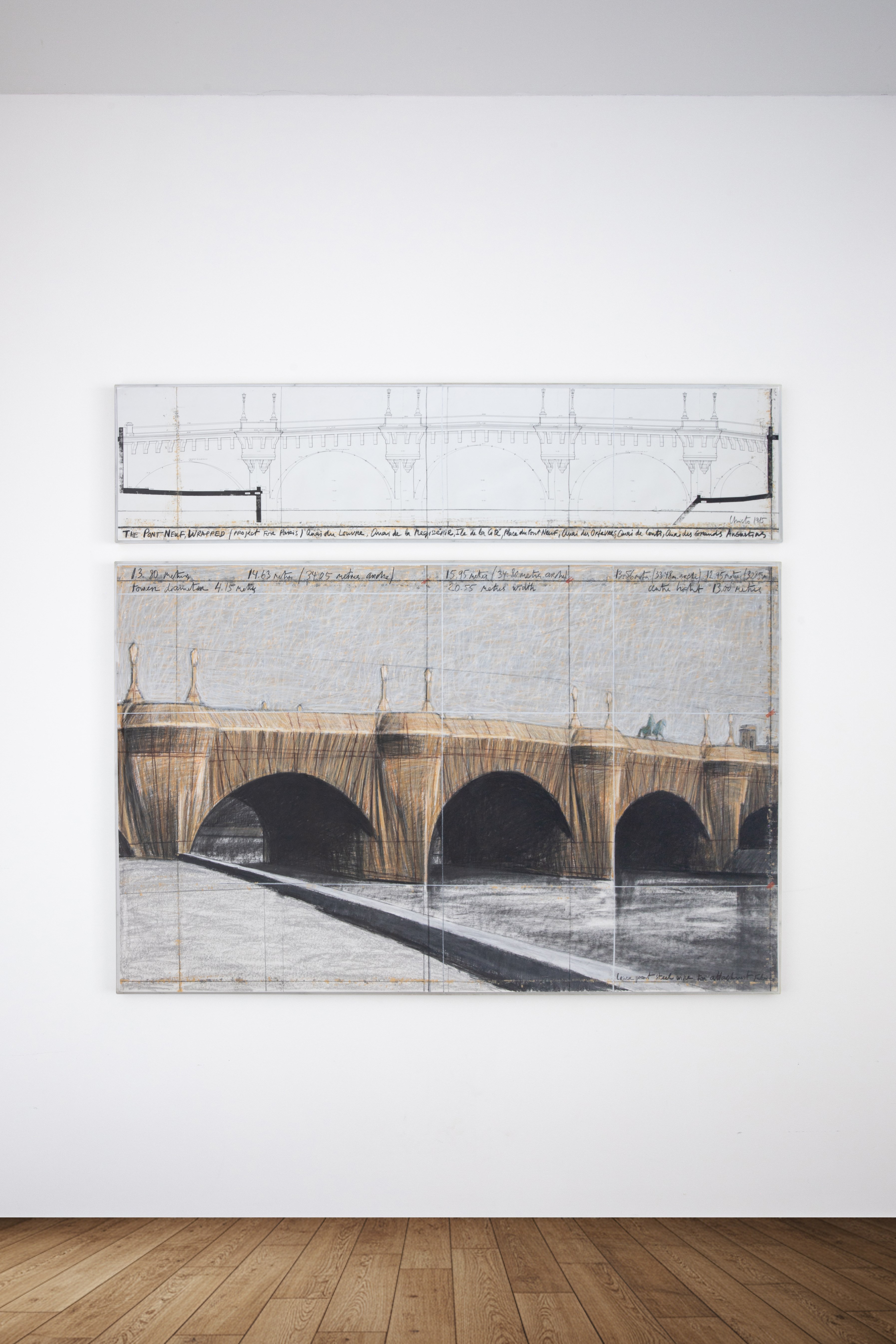 Christo (Bulgaria 1935-2020 New York) and Jeanne-Claude (Casablanca 1935-2009 New York) The Pont Neuf Wrapped (Project for Paris), 1985 Pencil, charcoal, pastel, wax crayon, and technical data 144 x 165 cm (overall) Provenance: Wolfgang Volz collection; private collection Literature: Christo and Jeanne-Claude: Water Projects, Silvana 2016, p. 167