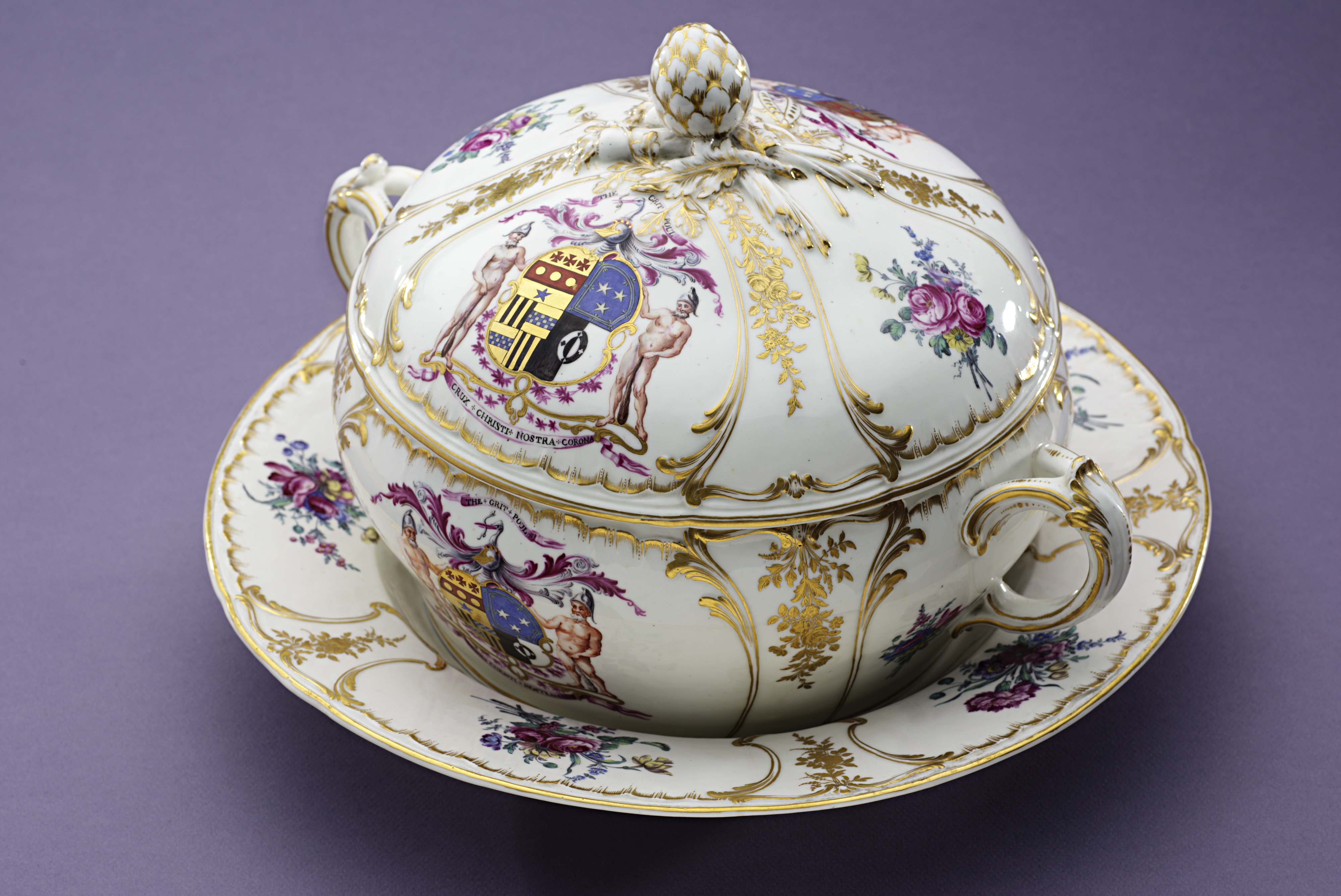 Soup tureen belonging to William Mercer of Aldie, 1770. Porcelain, soup tureen: Ø 37.5 cm, dish: Ø 39 cm