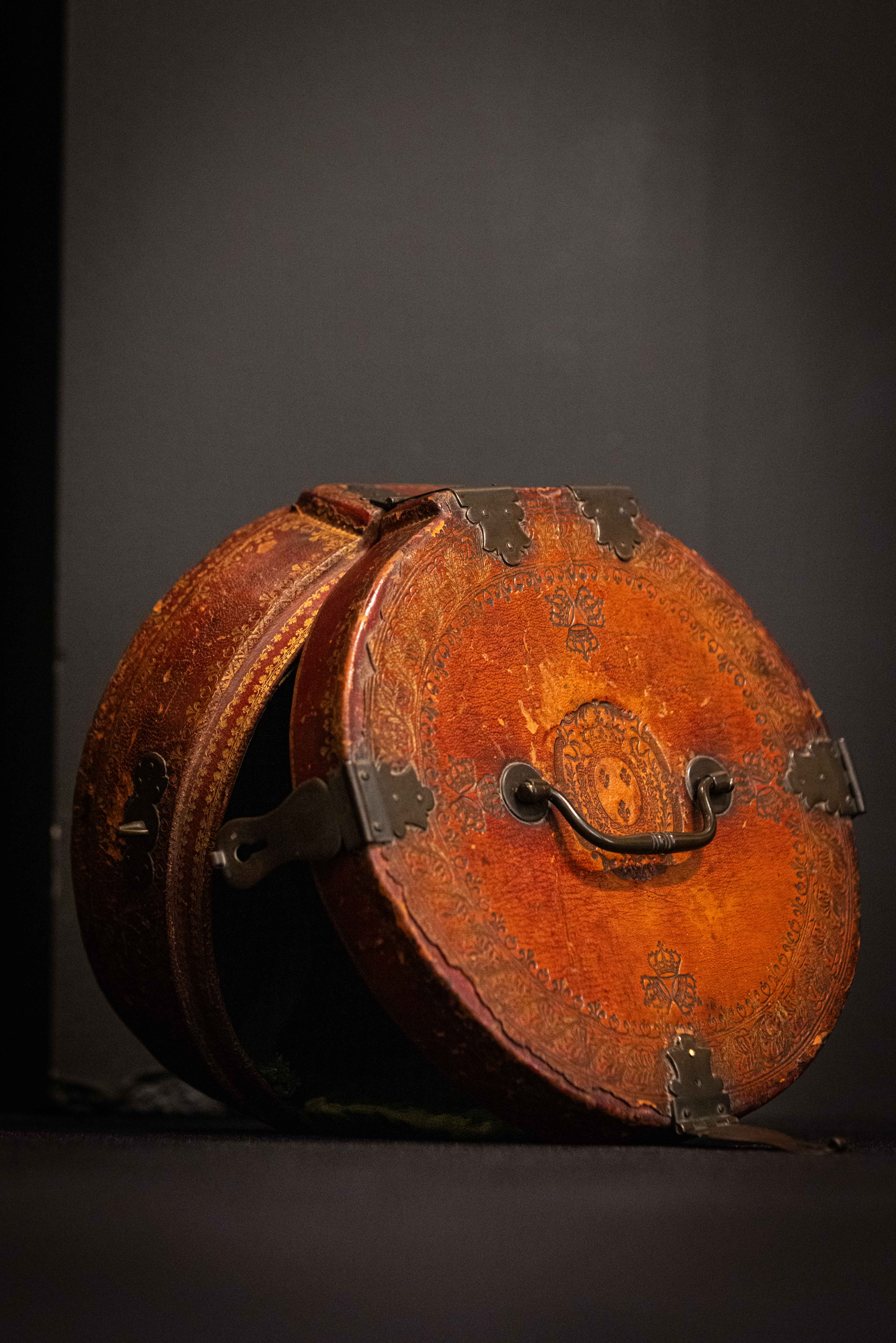 Transport case, for Louis XV at the Château de Versailles France, made between 1745-1749 Gilt-tooled leather, copper hinges H 11 cm - Ø 26.5 cm Provenance: Louis XV in Versailles Carrying and protective case for a silver porringer. The lid of the case is decorated with the coat of arms of Louis XV and the three facing crowns of the Château de Versailles, both gilt-tooled. All copper hinges are stamped with the crowned 'C' mark. The case was made between March 5th, 1745 and February 4th, 1749.