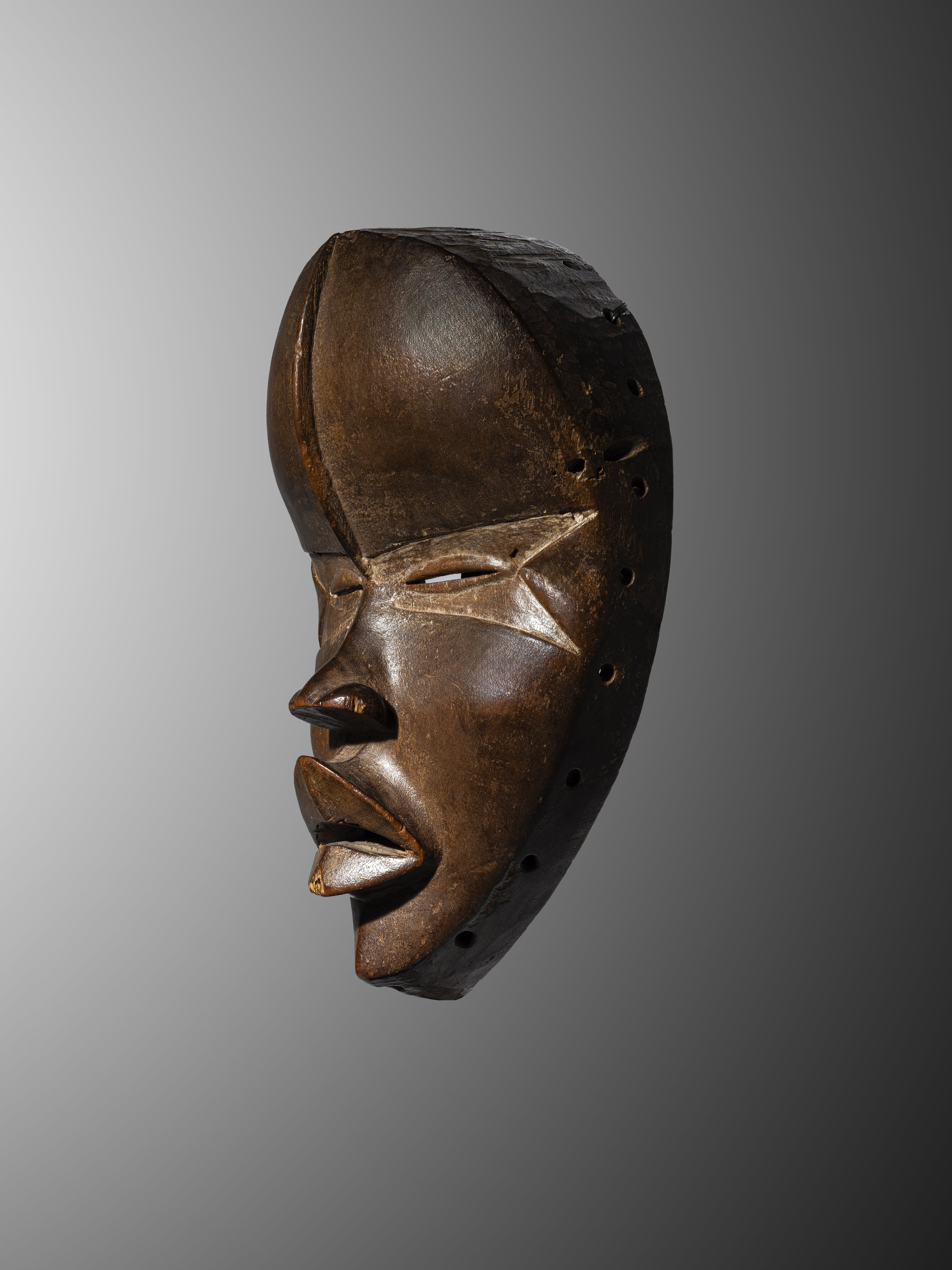 Dan 'deangle' Mask Ivory Coast, Dan people Presumed early 20th century Wood and pigment H 25 cm Provenance: Hubert Goldet (1945–2000), Paris, until 1972; Lucien Van de Velde (1933-), Antwerp, from 1972 to 1975; René (1901-1998) & Odette (1925–2012) Delenne, Brussels Literature: Arts d’Afrique Noire 34, 1988, p. 49; Utotombo, Kunst uit Zwart-Afrika in Belgisch privé-bezit, de Heusch, Brussels, 1988, p. 148, fig. 59; A ‘Harley Mask’ at the Cleveland Museum of Art: More on Masks among the Mano and Dan Peoples, Petridis, African Arts, Vol. 45, n° 1, 2012, p. 31, fig. 8; Trésors de Côte d’Ivoire, Neyt, Fonds Mercator, Brussels, 2014, p. 44-45, fig. 18 (indication: H. 26 cm); The Language of Beauty in African Art, Petridis, The Art Institute of Chicago, 2022, p. 207, fig. 164 Exhibitions: Utotombo. Kunst uit Zwart-Afrika in Belgisch privé-bezit, Palais des Beaux Arts, Brussels, 25 March-5 June 1988; The Language of Beauty in African Art, The Art Institute of Chicago, Chicago, 20 January 2022-27 March 2023 Originating from the northwest of Côte d’Ivoire, near the borders of Liberia and Guinea, the Dan are an agricultural people who primarily cultivate rice and cassava. Their way of life, complemented by hunting, fishing, and gathering, is rooted in a patrilineal society without a central authority, structured around clans led by chiefs chosen for their prestige, bravery, or agricultural success. Relations between clans, often marked by rivalries, gave rise to a rigorous social organization: young warriors ensured the group’s defense, while chiefs reinforced their influence through feasts and gifts. Local power rested on a balance between the chief, the council of elders, and the male associations, which upheld discipline, guided the initiation of young men, and preserved community cohesion. The Dan distinguish between two worlds: that of the village - a humanized and social space - and that of the forest, the realm of spirits and natural forces. It is within this duality that their art takes root, renowned for its independence and for the diversity of its styles from one village to another. In their pursuit of formal perfection, Dan artists express through their works an ideal of beauty that is both spiritual and harmonious. A symbol of this aesthetic quest, the Dan 'deangle' mask is characterized by its regular oval shape, polished surface, narrow eyes, short nose, and full, slightly parted lips. The raised scarifications emphasize the geometry and graphic strength of the composition. Of an elegance imbued with softness and femininity, it embodies the Dan ideal of beauty. Used within the Leopard secret society (go), associated with the pacifying spirit zlan, this mask served as an intermediary between young initiates and the village community. First exhibited and published for the general public in 1988, this exceptional work was most recently presented (in 2022) at the Chicago Museum. The mask’s deep gaze, highlighted by a fine band across the eyes, captures the viewer’s attention. Its patina, with warm brown reflections, and its concave form lend it a presence that is both powerful and serene.