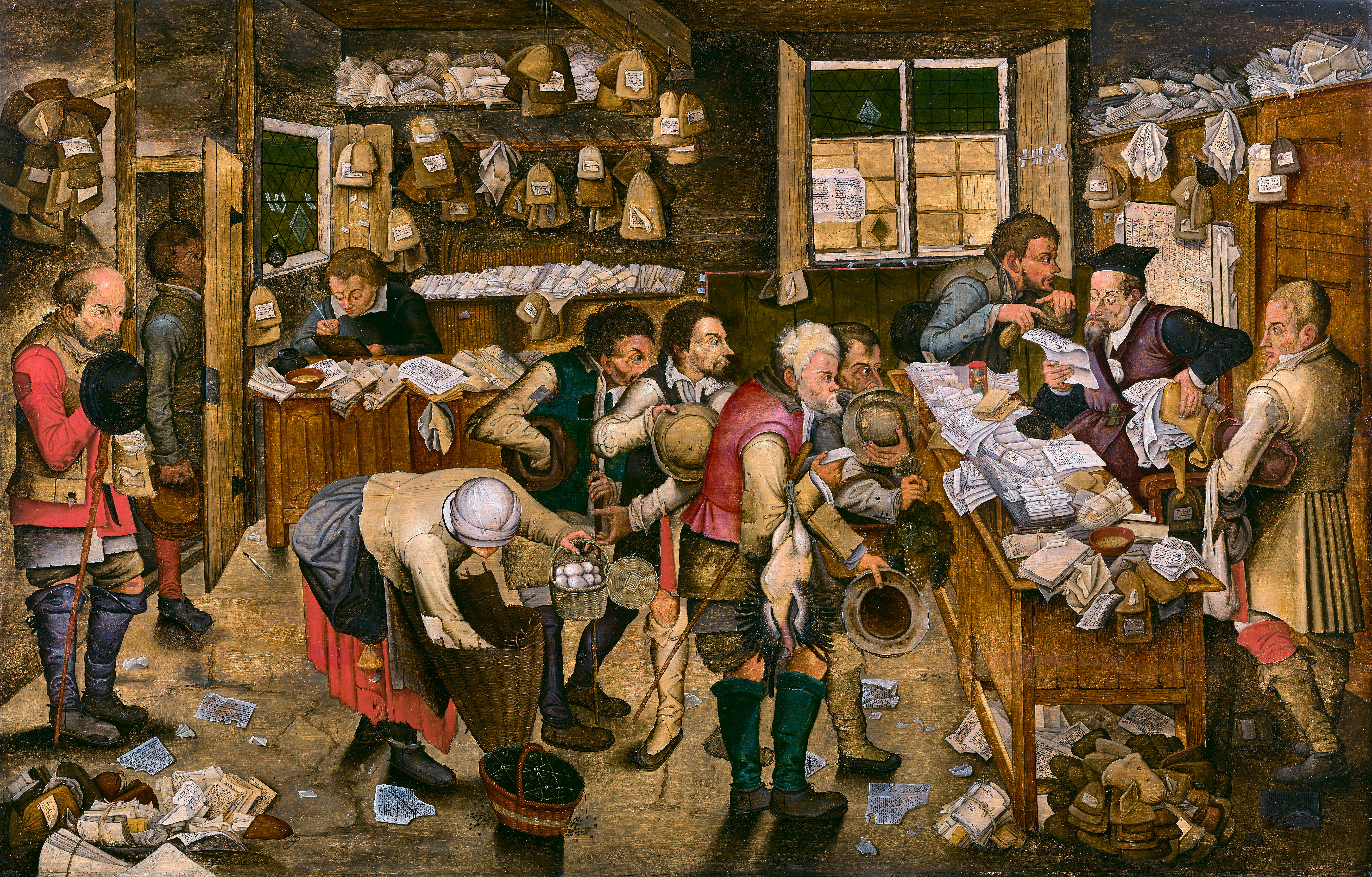 Pieter Brueghel the Younger (Brussels 1564-1638 Antwerp) The Payment of the Tithe or the Village Lawyer, 1622 Oil on panel 78.9 x 123.2 cm Signed and dated: P. BREVGHEL, 1622 Provenance: private collection, Belgium; Galerie Legenhoek, Paris, 1991; private collection, France Literature: Ertz, Klaus, Pieter Brueghel der Jüngere: Die Gemälde mit kritischem Oeuvrekatalog, Lingen, Luca Verlag, Vol. I, 2000, p. 513, cat. E 507, repr.; Curie, Christina, Allart, Dominique, The Brue[H]el Phenomenon, Brussels, Royal Institute for Cultural Heritage, vol. III, p. 1030-1031 This Payment of the Tithe, or The Village Lawyer, is marked by Pieter Brueghel the Younger’s verve, meticulous execution, and vibrant colours. The satirical subject mocks the profession of the lawyer responsible for collecting the heavy tax that the poorest peasants struggled to pay. The grotesque faces of the petitioners, as well as the lawyer’s prognathous jaw - associating him with the Spanish authorities then in power - fascinate through their caricatural force. This original composition by Pieter Brueghel the Younger stimulated the market of the time, generating strong demand. The success of this still-relevant satire has endured to the present day.