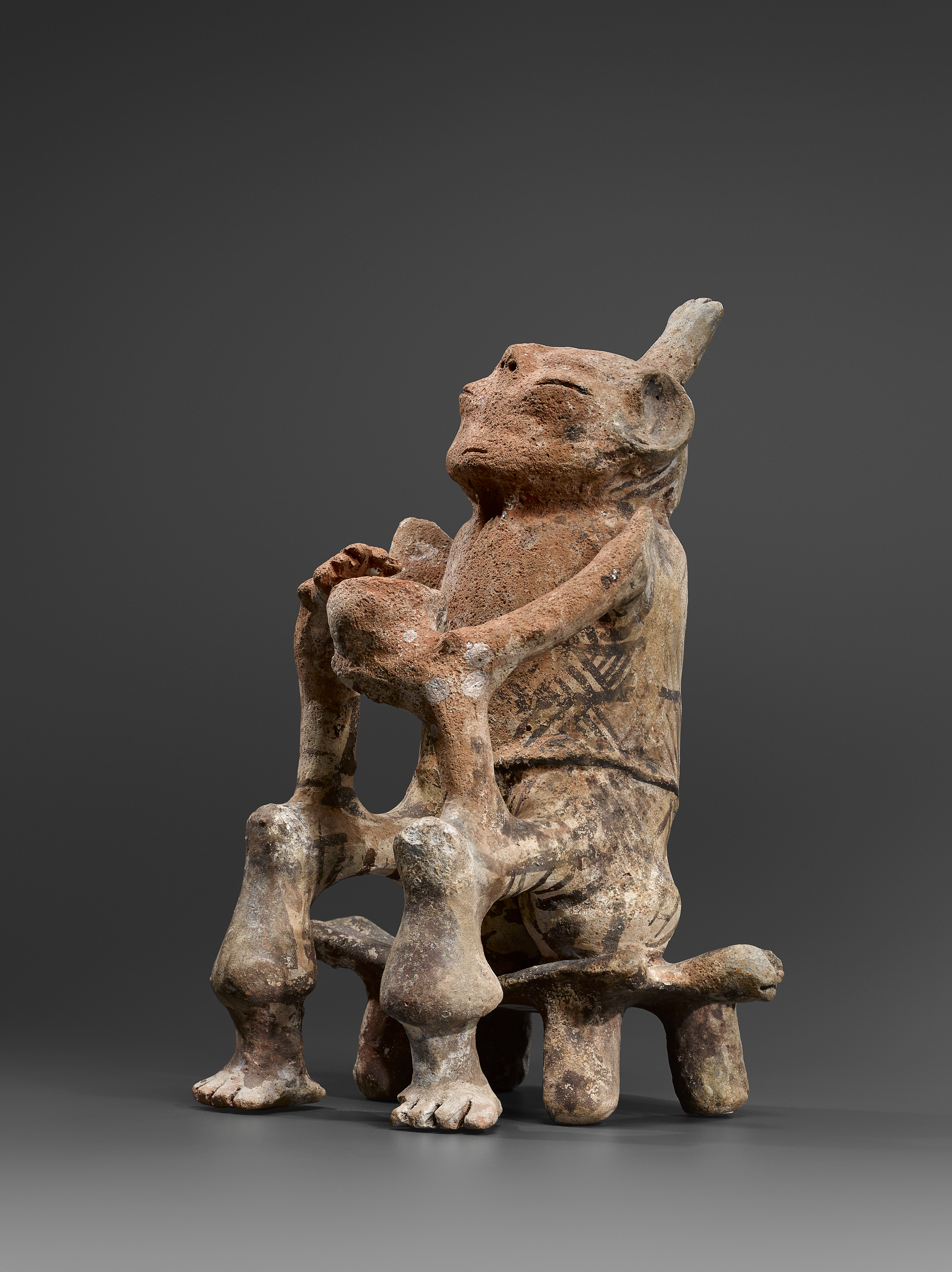 Sitting male figure Timoto-Cuica, 900-1300 AD Trujillo State, Venezuela Terracotta, pigments H 29 x W 23 x D 17.5 cm Datation: TL test n° 481z12 by the Research Laboratory for Archaeology, Oxford University, United Kingdom, on 7 May 1991 Provenance: Galerie Ferrero, Geneva, 1968; collection Barbier-Mueller, Geneva, Inv. n° 530-2; Sotheby's auction, Paris, collection Barbier-Mueller-Art Précolombien, on 22 and 23 March 2013, n° 265 Literature: Paz, Octavio, Butor, Michel, Barbier, Jean-Paul, Stierlin, Henri, Lavallée, Danièle, Conceição G., Corrêa, Barry, Iris, 1992, Art millénaire des Amériques : de la découverte à l'admiration, 1492-1992, Arthaud, fig. 130, p. 178 & 179; Conceição G., Corrêa, Barry, Iris, 2002, Amazonie précolombienne, Museo Barbier-Mueller de Arte Precolombino, Barcelona, 5 Continents, fig. 4, p. 17; Benson, Elizabeth P., 2003, Trésors de la céramique précolombienne du Museo Barbier-Mueller de Arte Precolombino de Barcelona, Musée Barbier-Mueller et Somogy éditions d’art, fig. 44, p. 52
