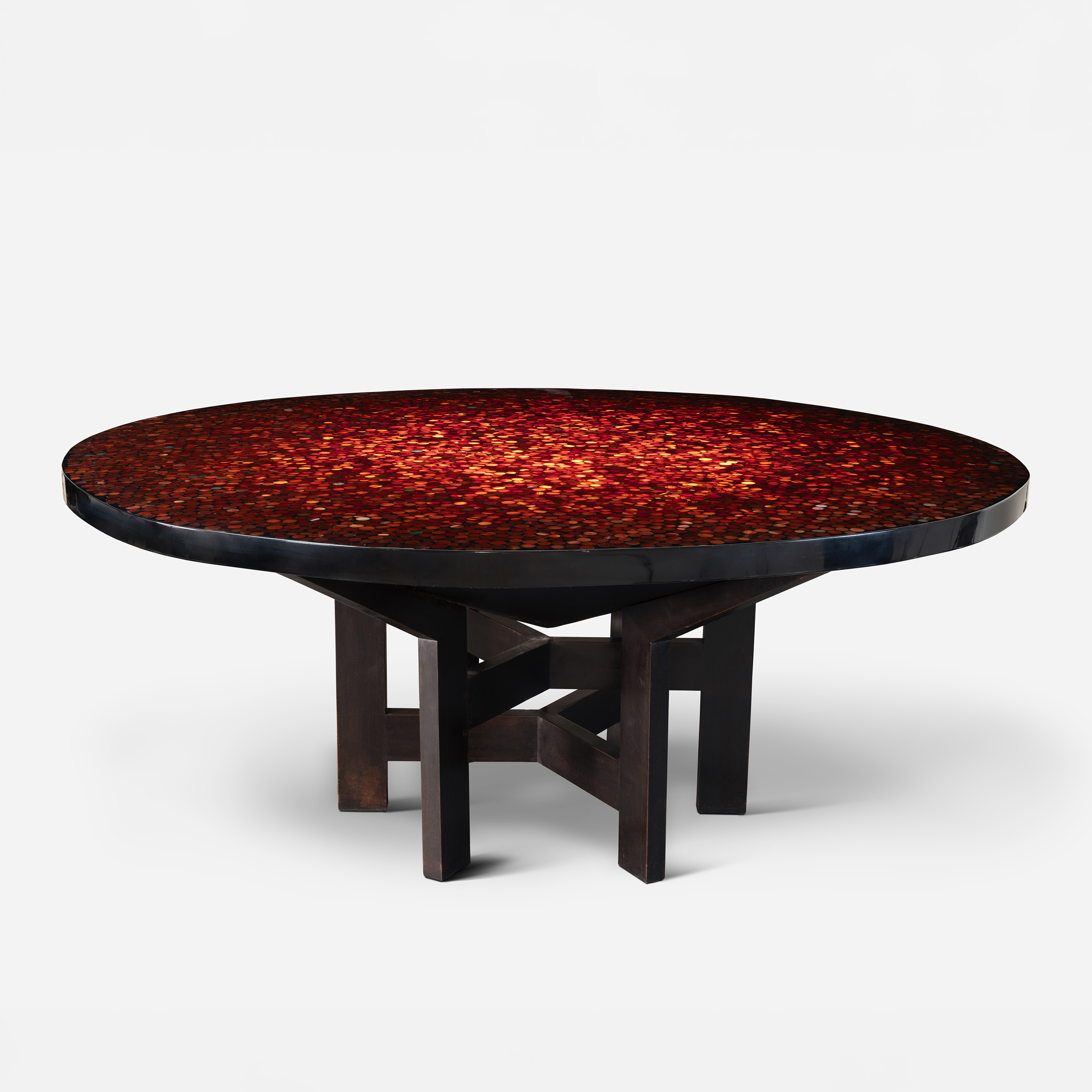 Ado Chale (Brussels, 1928-2025) Dining table, circa 1970 Resin top inlaid with carnelian agate stones H 71.5 cm - Ø 173 cm This work is accompanied by a certificate of authenticity issued by Ado Chale This table features a backlit tabletop that enhances its sculptural presence and creates a refined play of light and shadow.