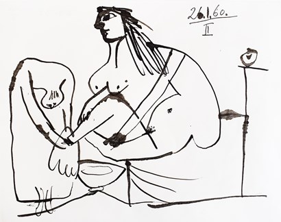 Pablo Picasso (Malaga 1881-1973 Mougins) Le bain de pieds, 1960 Brush and India ink drawing on wove paper 20.9 x 26.9 cm This ink drawing is dated 26.1.60.II in ink in the upper image. Picasso created this work on Tuesday 26 January 1960 Provenance: Forum Fine Art, Zurich; private collection, Switzerland; Christie's, London, 10 February 2005, lot 685 Literature: C. Zervos (1968), Pablo Picasso - Œuvres de 1959 à 1961, Paris, vol. 19, reference n° 137 (ill., pl. 32)