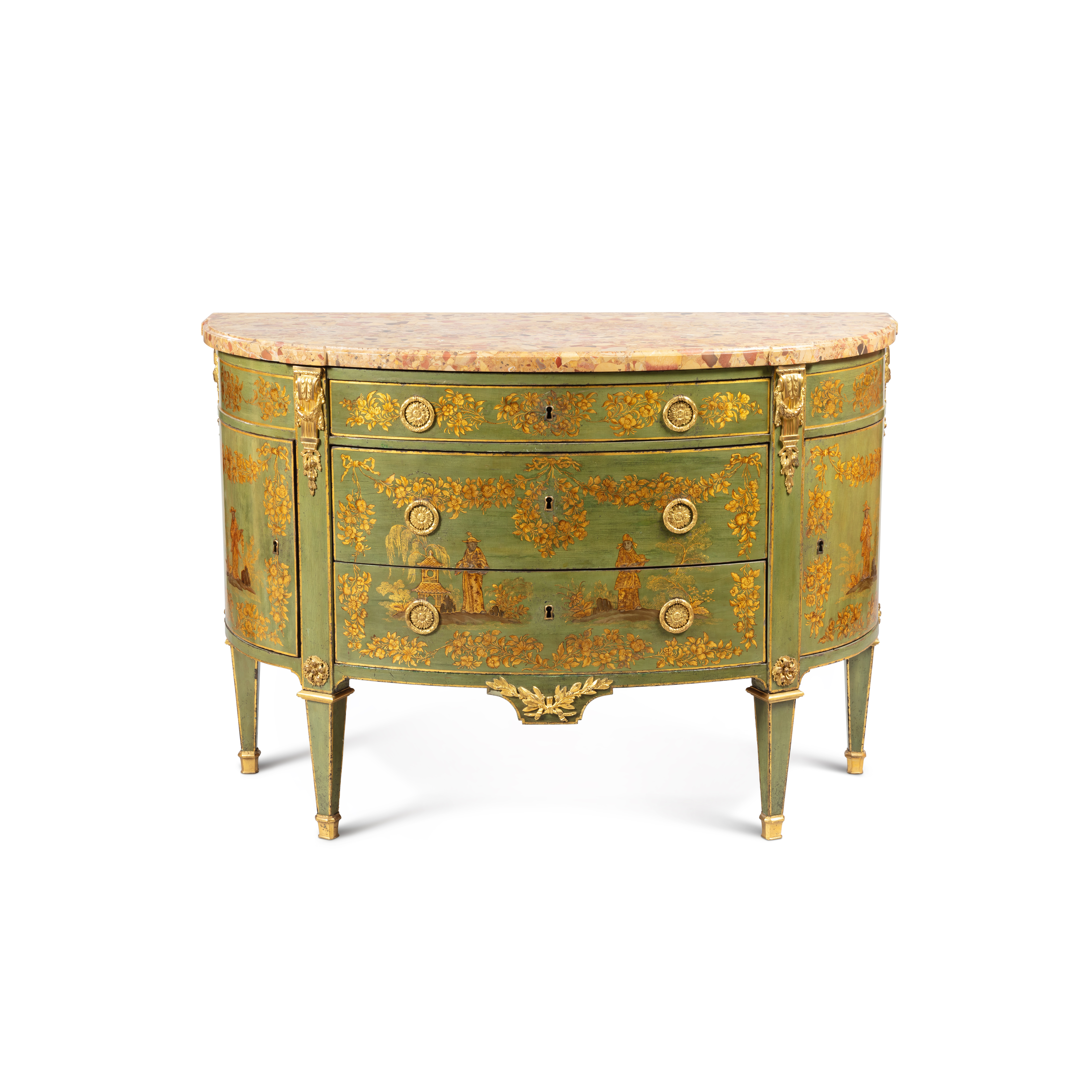 Chandelier in the 'Retour d’Égypte' style Paris, early 19th century Attributed to Benjamin Ladouèpe-Dufougerias and the 'Manufacture de Cristaux de Montcenis' Ormoulu, patinated and fire-gilt bronze for twelve candles H 130 cm - Ø circa 80 cm Provenance: private European collection This magnificent chandelier exemplifies the short-lived yet influential 'Retour d’Égypte' style, which emerged in the wake of Napoleon’s Egyptian campaign (1798–1801). At its centre stands an amphora-shaped patinated urn, crowned with a flaming finial and surmounted by a pinecone. From the urn’s body spring twelve elegantly curved candle arms arranged in two tiers, richly ornamented with foliage motifs and set between four stylised Egyptian masks. The chandelier is suspended by four chains leading to an imposing corona adorned with leonine masks and voluted floral decoration. The style was largely shaped by the architects Charles Percier and Pierre François Léonard Fontaine, whose neoclassical designs laid the foundation for this decorative vocabulary. It endured only briefly before giving way to the Empire style with the establishment of Napoleon and the First French Empire. Provenance and Comparanda: A closely related chandelier for twelve lights, attributed to the Manufacture de Cristaux de la Reine, is preserved in the collections at Versailles, formerly installed in Marie-Antoinette’s inner cabinet at the Petit Trianon.