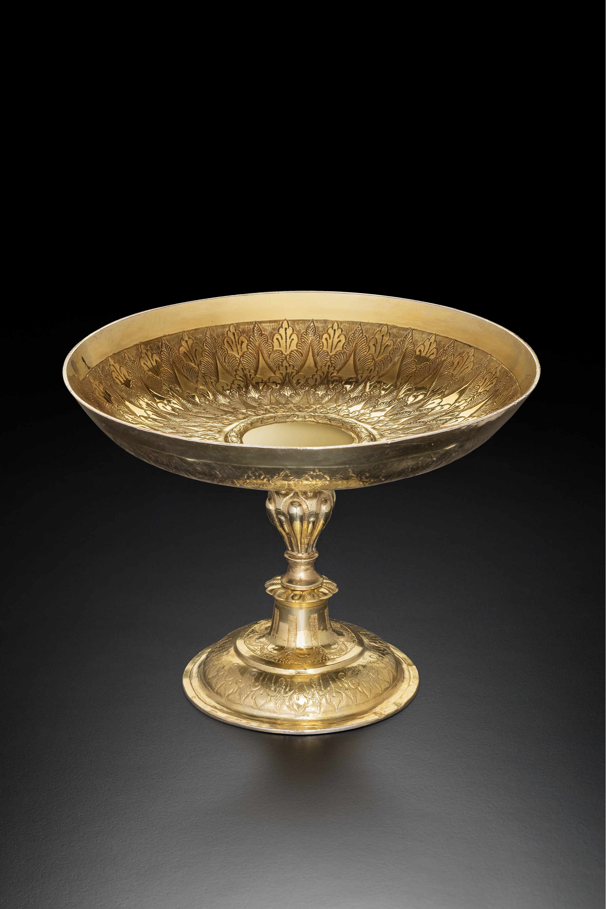 Umbilicated dish and gadrooned basin in enameled copper Venise, circa 1500-1530 Ø 33 cm Provenance: collection Messel, Darmstadt; collection Ludwig and Anne Messel, London; collection Leonard and Maud Messel, London until 1953; Galerie Kugel, Paris; private collection, Switzerland Literature: Les cuivres émaillés dits Vénitiens, Corpus des œuvres en collections publiques et privées, Silvana Editoriale, 2018, Volume II, n° 34, p. 92 Twelve convex, curved white gadroons with blue highlights on a green background. This enamel production in Venice spans over a very short period within Venetian Decorative Arts. The basin is adorned with two rows of 24 concave, curved gadroons, then with scale-like motifs. The entirely blue reverse is richly decorated with gilded patterns.