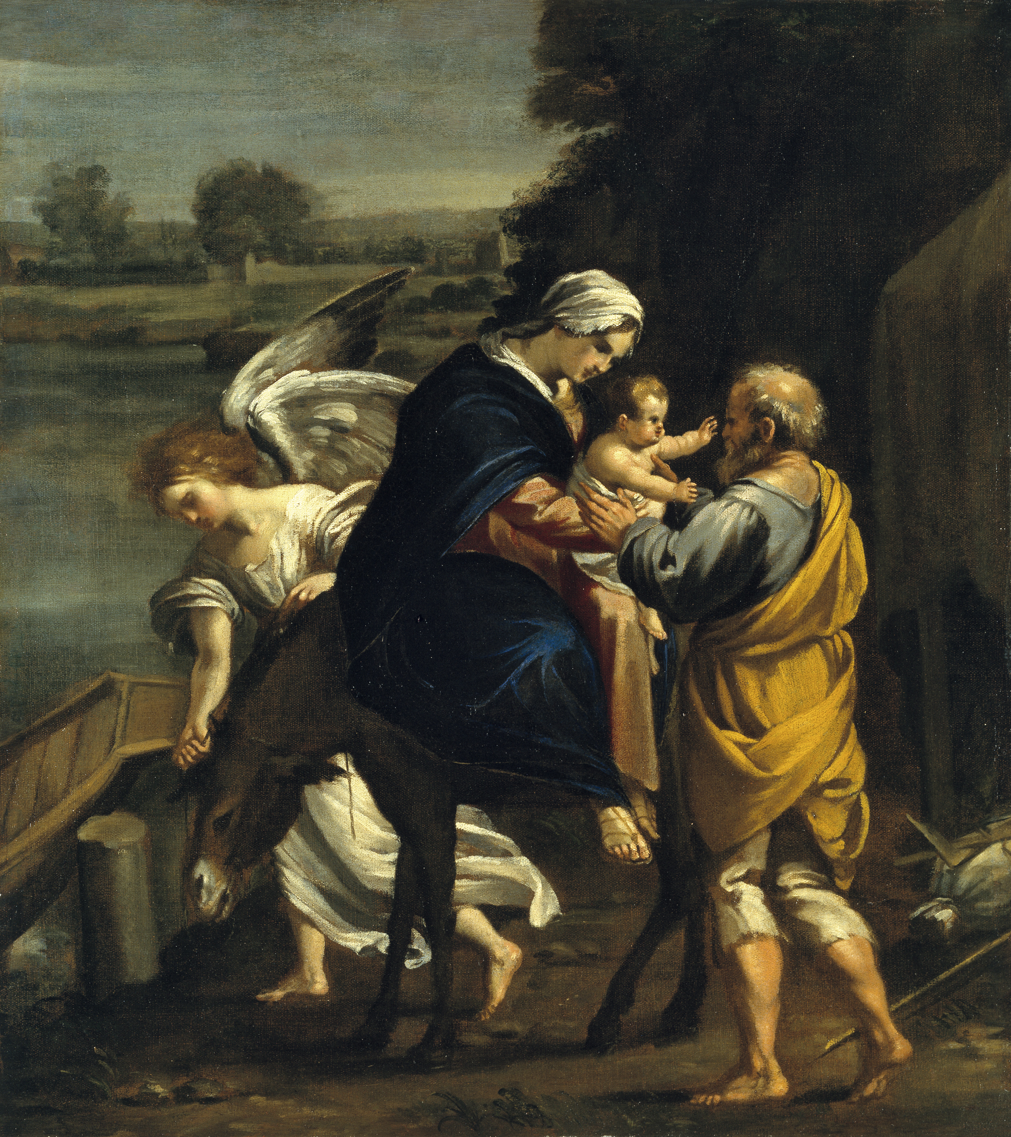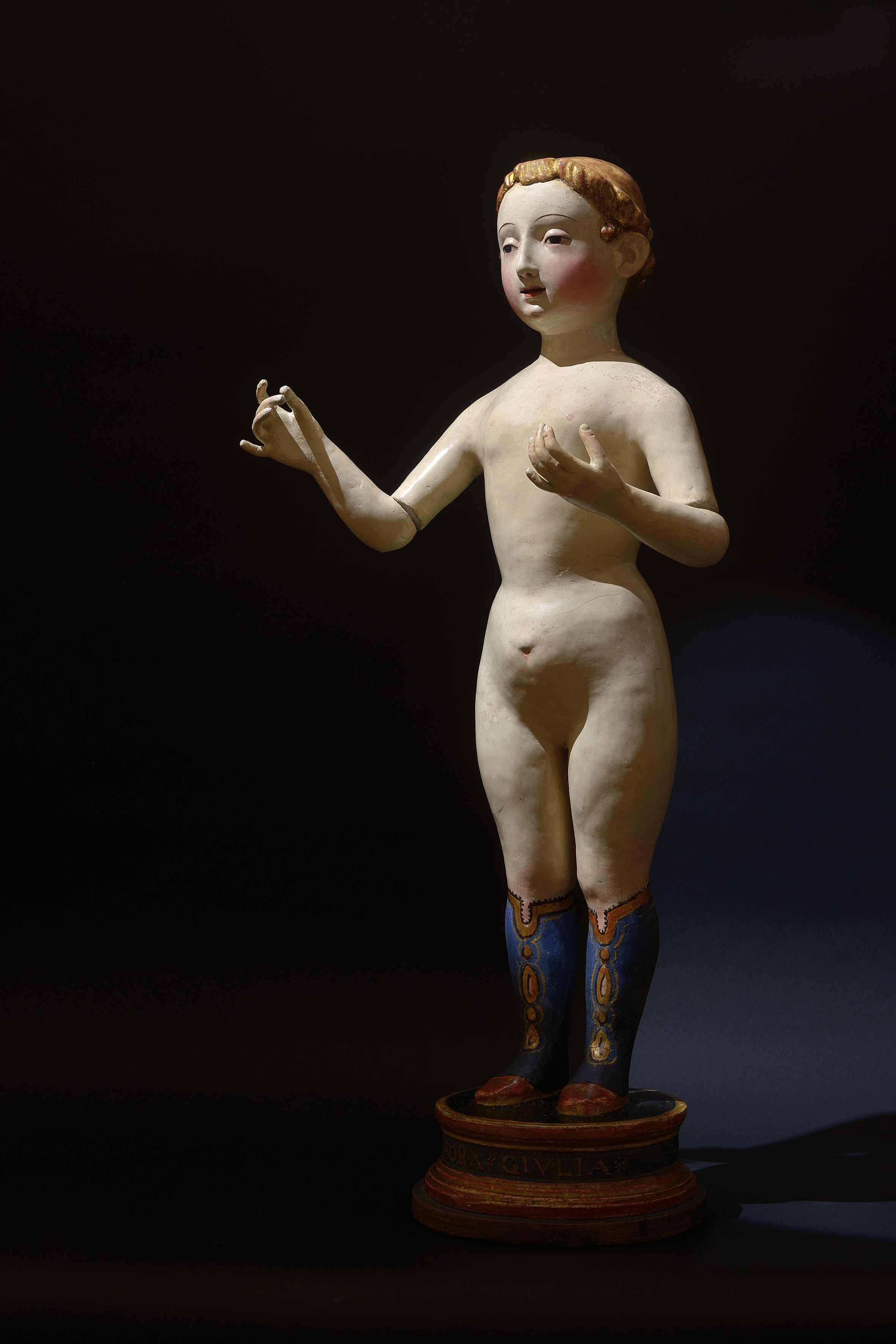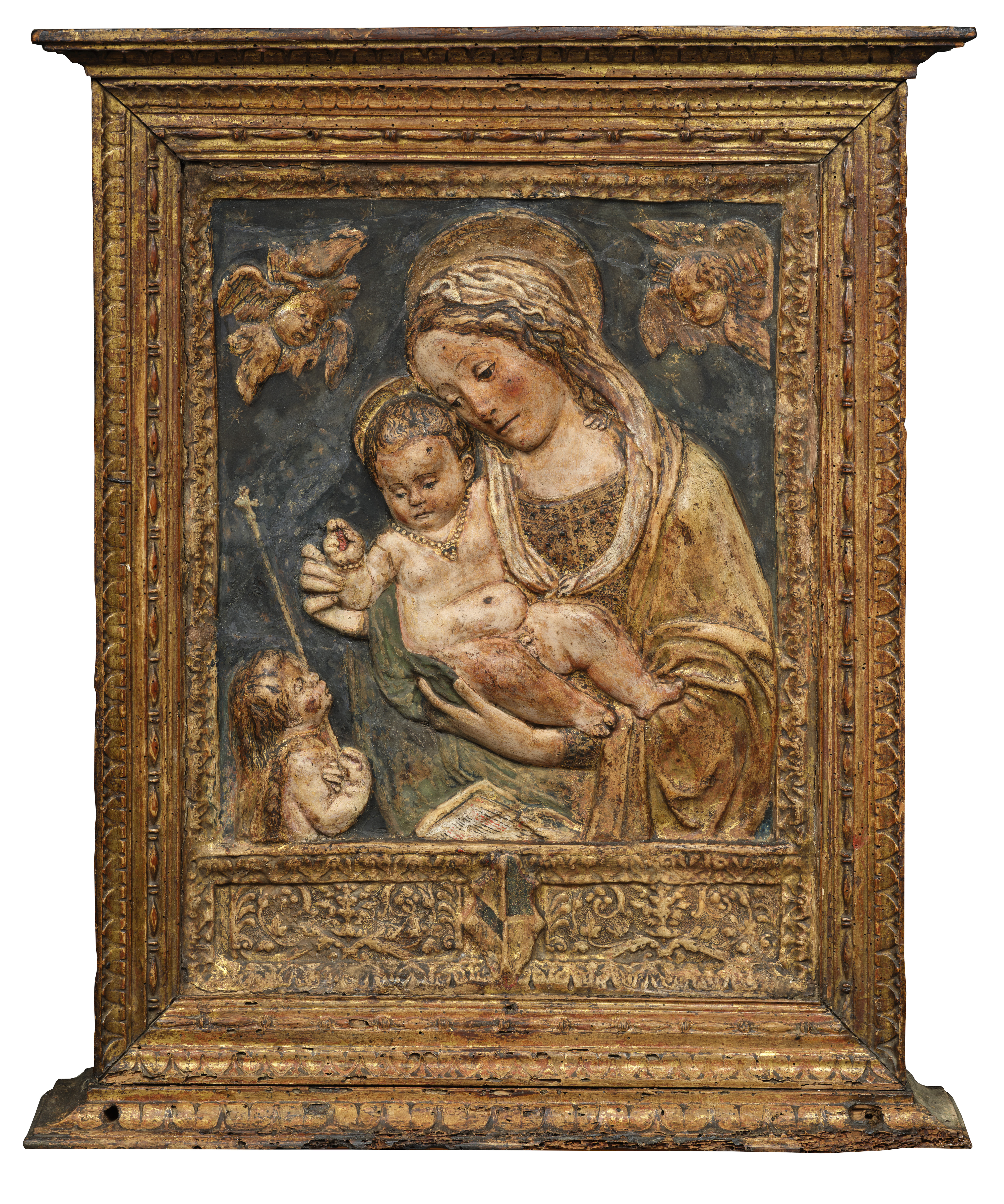Netherlandish School, circa 1500 Triptych with the Crucifixion and scenes from the Passion Oil on panel 51 x 36.5 cm (closed) 51 x 73 cm (open) The gallery is grateful to Dr. Didier Martens for his expertise The Crucifixion with Saint Jerome and Saint Dominic and Scenes from the Passion, Original frame. This triptych depicts Christ on the Cross, flanked by the sorrowful figures of the Virgin Mary and Saint John the Evangelist. Kneeling at the foot of the Cross are Saint Jerome and Saint Dominic, the latter holding a rosary. In the landscape beyond unfold several scenes from Christ’s Passion, culminating in the Crucifixion. This version follows the composition preserved in the Scottish National Gallery, Edinburgh, which originally formed one half of a diptych. Its companion panel, depicting The Coronation of the Virgin, is held in the Museum Boijmans Van Beuningen, Rotterdam. The distinctive iconography is closely associated with the Dominican devotion to the Rosary. Surrounding the central Crucifixion are smaller narrative scenes illustrating key moments from the Passion of Christ: • Christ in the Garden of Olives: Following the Last Supper, Christ withdraws to the Garden of Gethsemane on the Mount of Olives. In deep anguish, he prays to be spared his suffering, while ultimately submitting to God’s will. • The Circumcision: According to the Gospel of Luke, this event occurred eight days after Christ’s birth, during the Brit Milah ceremony at which he received his name. • The Flagellation: This scene depicts the scourging ordered by Pontius Pilate, the customary prelude to crucifixion under Roman law. • Christ on the Cold Stone: The pensive Christ sits, crowned with thorns and bearing the marks of his scourging, his head resting in contemplation. This image reflects the influence of the Devotio Moderna, a movement that emphasized Christ’s human suffering as a model for personal devotion.