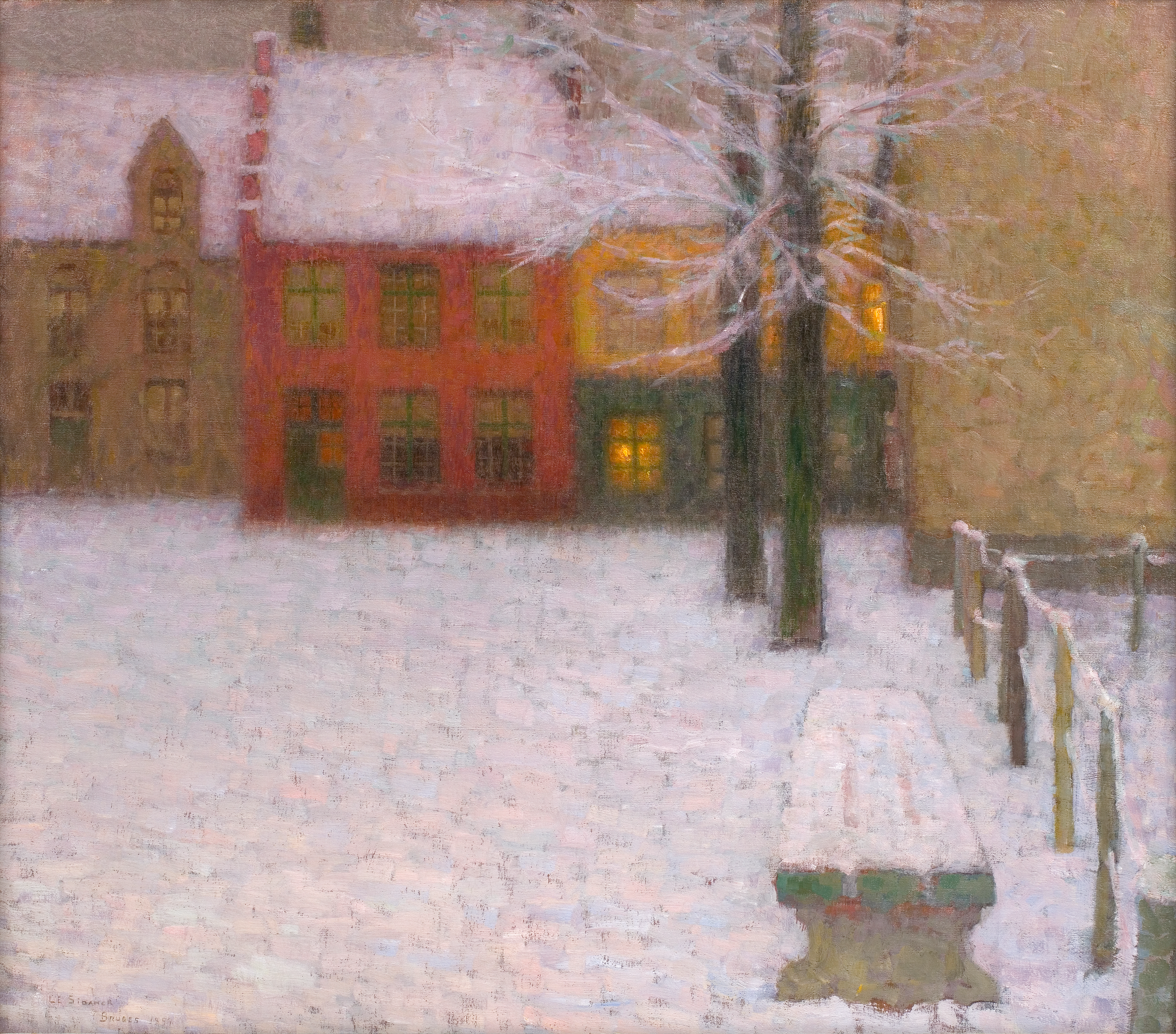 Henri Le Sidaner (Mauritius, Port Louis 1862-1939 Versailles) La Neige, 1899 Oil on canvas 66 x 75 cm Signed, dated and inscribed ‘Le Sidaner Bruges 1899’ Provenance: James Fulton, Paisley; Paisley Art Institute, Paisley, a bequest from the above in 1933 Literature: W. Philip Mayes, Illustrated Catalogue of Paintings, Drawings, Sculpture in the Collections of Paisley Corporation and Paisley Art Institute, Paisley, 1948, n° A189au., p. 49 (titled 'The Red House'); Y. Farinaux-le Sidaner, Le Sidaner: L'oeuvre peint et gravé, Milan, 1989, ill. p. 70, n° 86