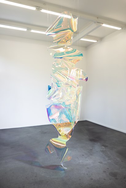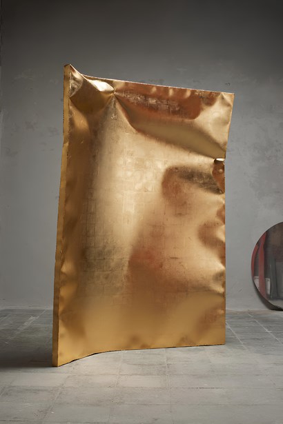 Ben Storms (Ghent, 1983) Crushed room divider, 2024 H 195 x W 160 x D 45 cm Stainless steel, gold leaf Provenance: the artist's studio The purpose of this volume is deliberately ambiguous. The object is primarily sculptural, a monumental entity that redefines a space. Yet in doing so, it also reveals its potential function. In the way that the work structures a space, it turns out to be a divider that demarcates and defines compartments or areas. The starting point for this room divider and sculpture is essentially a provisional form. A composition of several sheets of metal welded together with air in between - think of Ben’s In Hale series, but in a different sense. The actual form is then created by subjecting this makeshift composition to external forces, crushing the surfaces until the volume finds its current state.