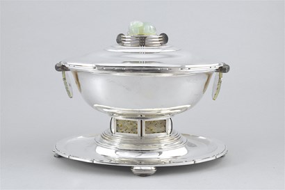Silver box in jade Paris, 19th century Sterling silver, jade W 35 cm - 4400 gr (total weight) Bears retailer's stamp, Boin-Taburet and maker's mark, Henry & Fils Boin-Taburet were formed in 1873 and quickly established themselves as one of Pairs's most noteworthy makers & retailers, winning a Gold medal at the 1889 Paris Exposition Universelle. Arguably their most distinctive work married silver and silver-gilt with other materials including porcelain, marble, and in the case of this stunning Art Deco tureen, jade. Jade was seemingly a less often used material - the only other piece found with a similarly carved jade element was a box that fetched an incredible amount at auction in 2012.