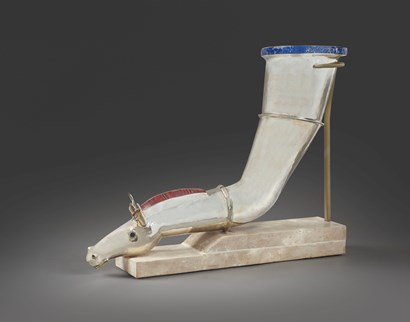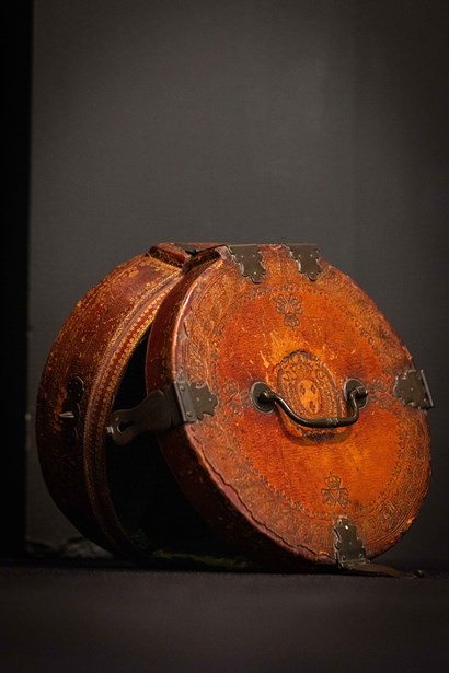 Transport case in gilt-tooled leather. For Louis XV at the Château de Versailles. France, made between 1745-1749 Gilt-tooled leather, copper hinges Provenance: Louis XV in Versailles Carrying and protective case for a silver porringer. The lid of the case is decorated with the coat of arms of Louis XV and the three facing crowns of the Château de Versailles, both gilt-tooled. All copper hinges are stamped with the crowned 'C' mark. The case was made between 5 March 1745 and 4 February 1749