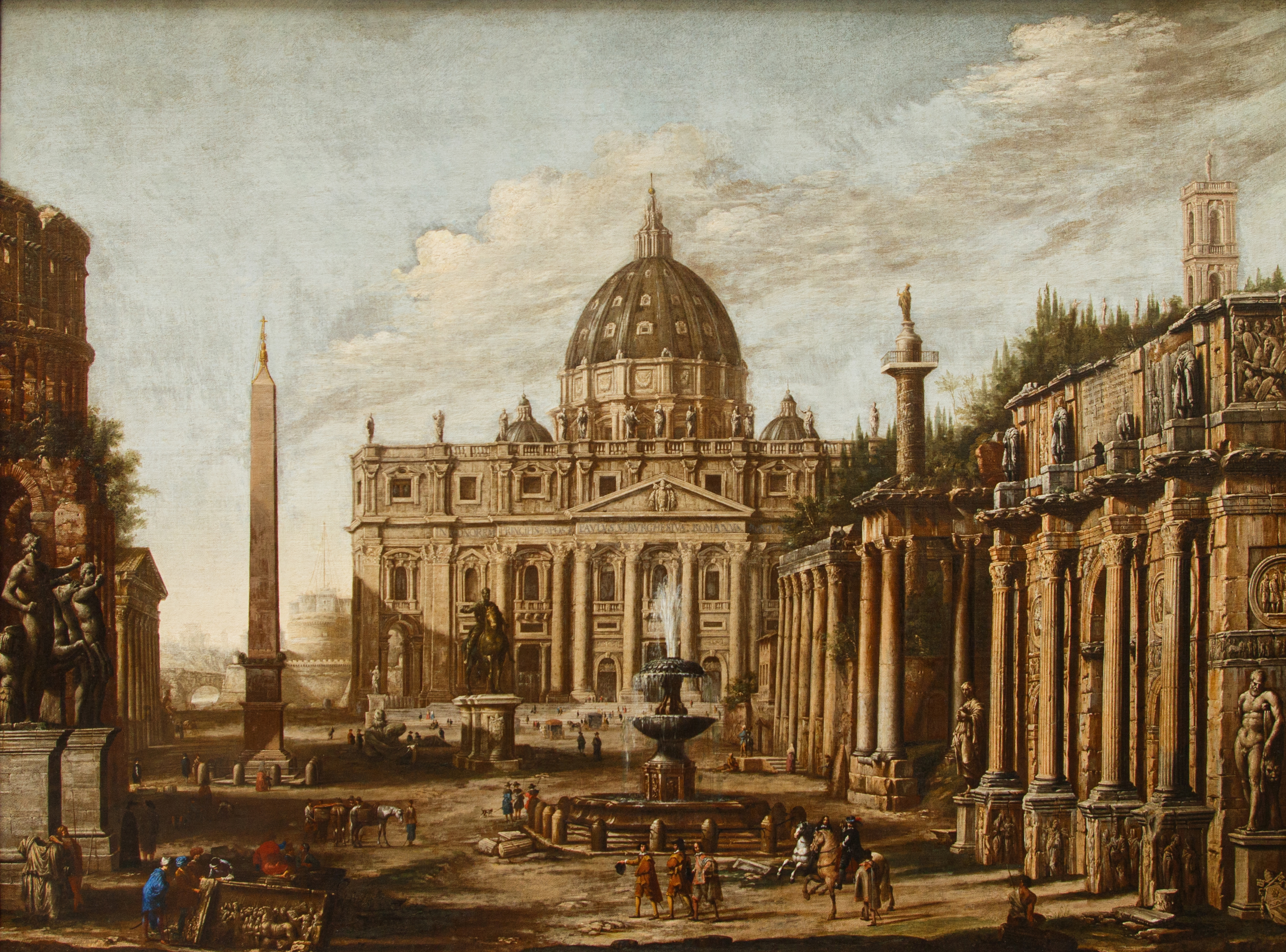 Viviano Codazzi (Italy, Bergamo 1604-1670 Rome) and Jan Miel (Belgium, Beveren 1599-1663 Turin, Italy) Architectural Capriccio with a View of Saint Peter's Basilica and Classical Antiquities First half of the 17th century Oil on canvas 149 x 200 cm Authenticated by Professor Alessandro Agresti