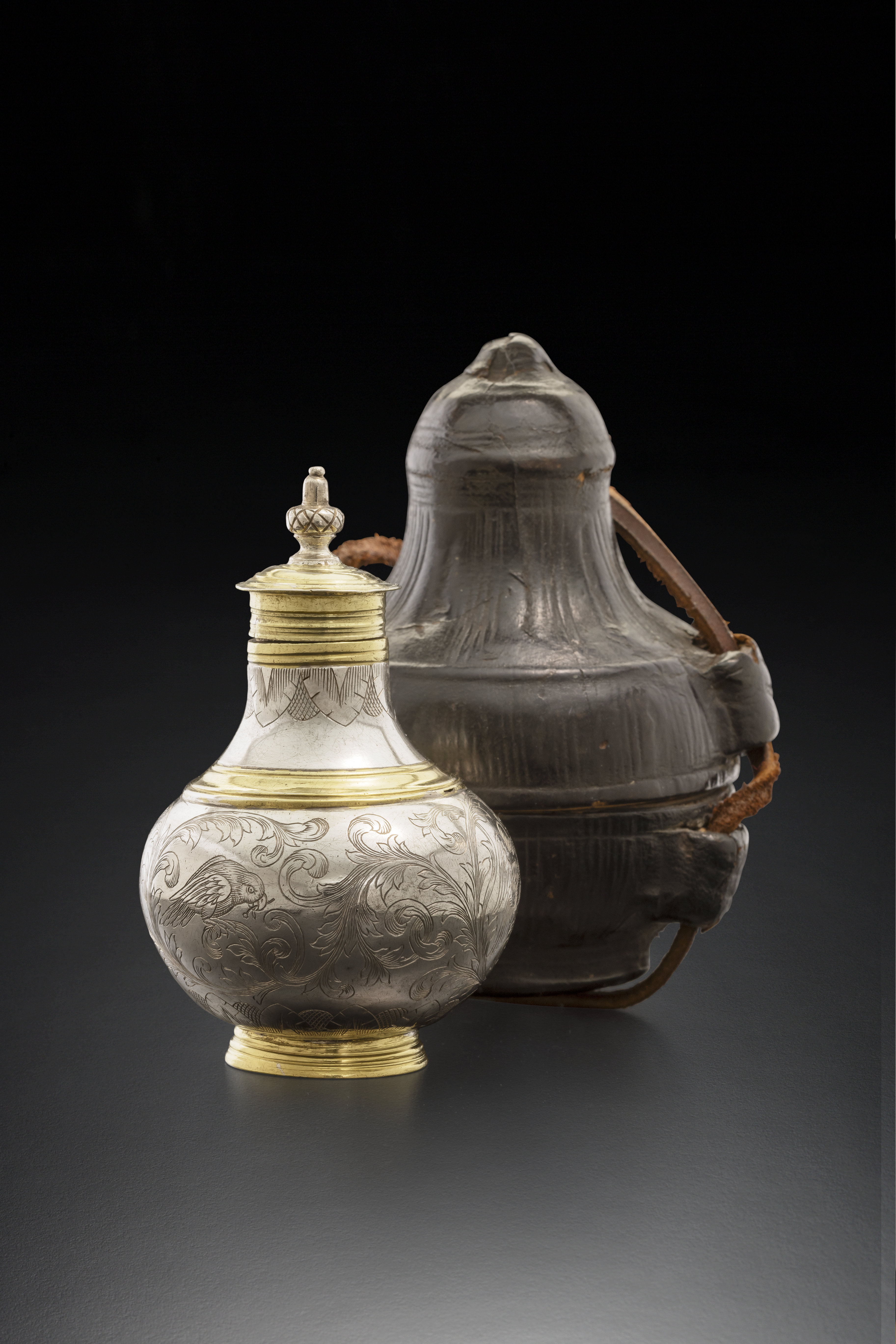 Perfume bottle and case Germany, circa 1620 Anonymous silversmith Chased, engraved, and partially gilded silver. Case in boiled leather. H 9 cm – Weight: 58 g This elegant perfume bottle stands out for the exceptional preservation of its original boiled leather case, a testament to the care taken in protecting and transporting such precious objects in the 17th century. The bottle features a finely engraved vegetal motif enlivened with small exotic birds, typical of the work of silversmiths from southern Germany during the first third of the century. At a time when the distillation of essences was still in its infancy, such bottles accompanied the daily life of the elite, allowing the frequent application of fleeting perfumes. This model, fitted with a screw cap ensuring perfect sealing, illustrates both the practical function and the symbolic value of perfume as a marker of social distinction.