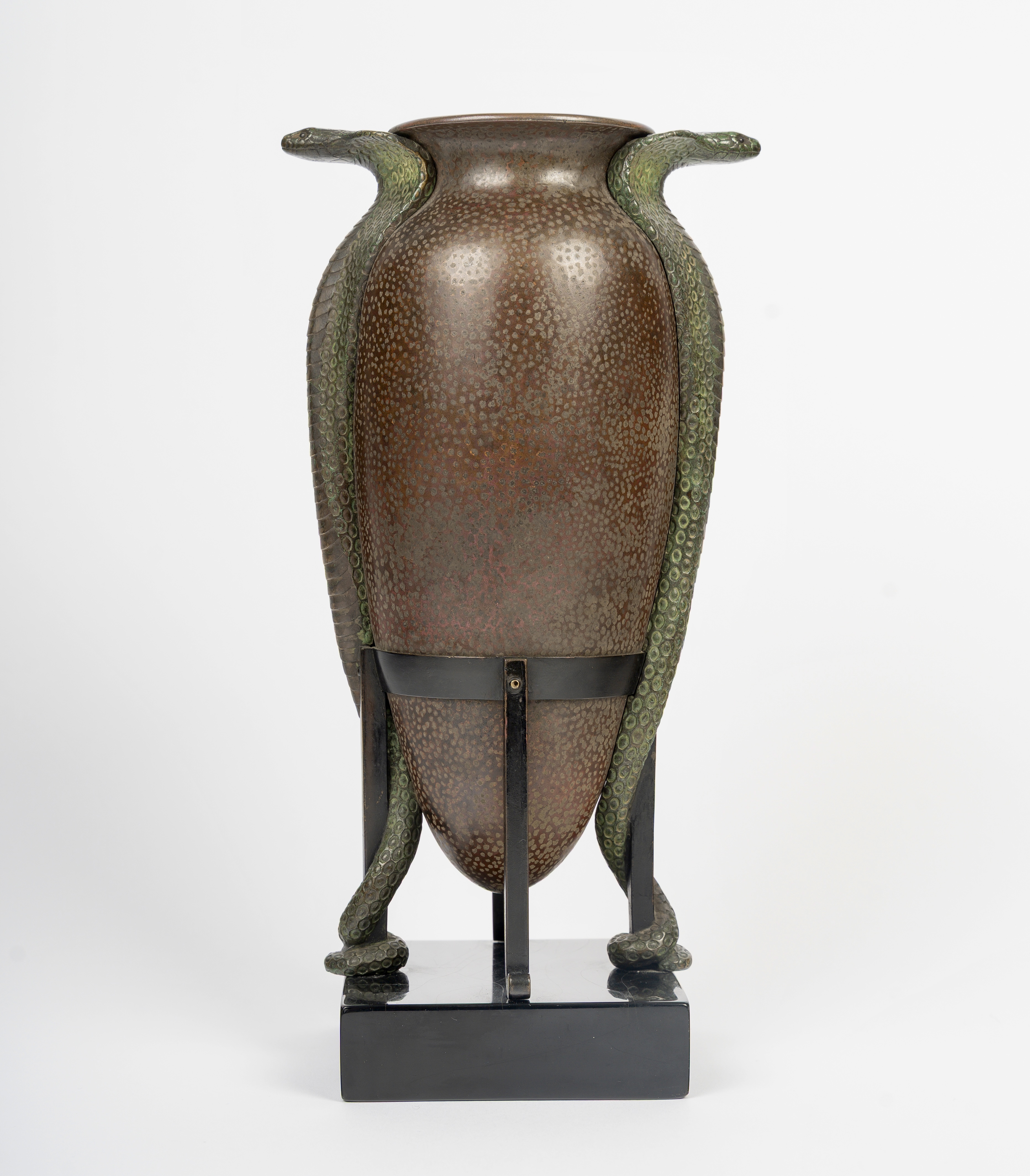 Jean Dunand (Lancy 1877-1942 Paris) Cobra vase, circa 1913 Patinated and hammered copper, patinated bronze, wrought iron and lacquered wood base H 28.5 cm Signed Provenance: property of Bernard Laurent, France Literature: Art et Décoration, July 1914-December 1919, p. 121