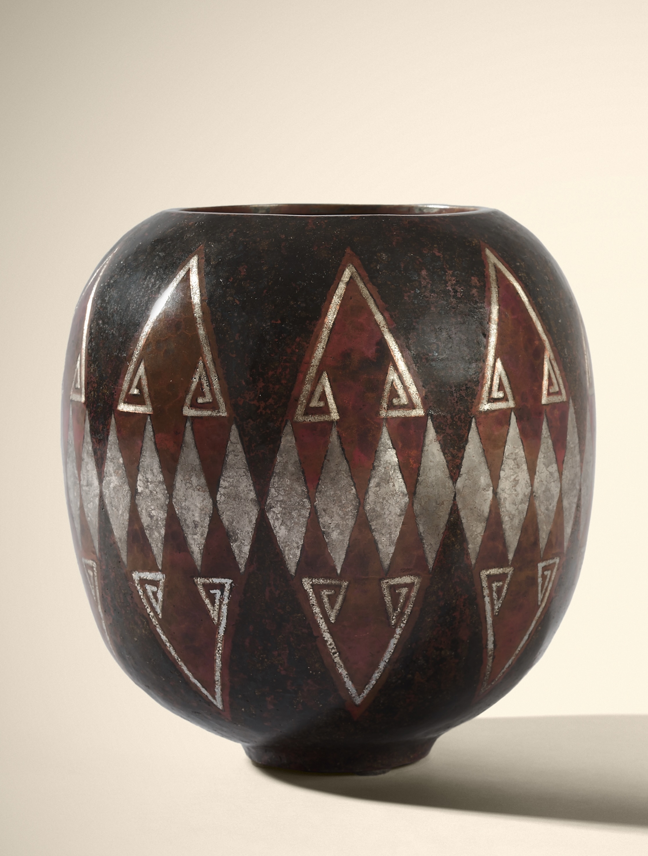 Claudius Linossier (Lyon, 1893-1953) Vase, circa 1930 Copper dinanderie on a fire-patinated ground with red tones in the central section and black shading at the top and bottom, decorated with an inlaid silver frieze and silver triangles H 18 cm - ∅ 18 cm Signed 'Linossier'