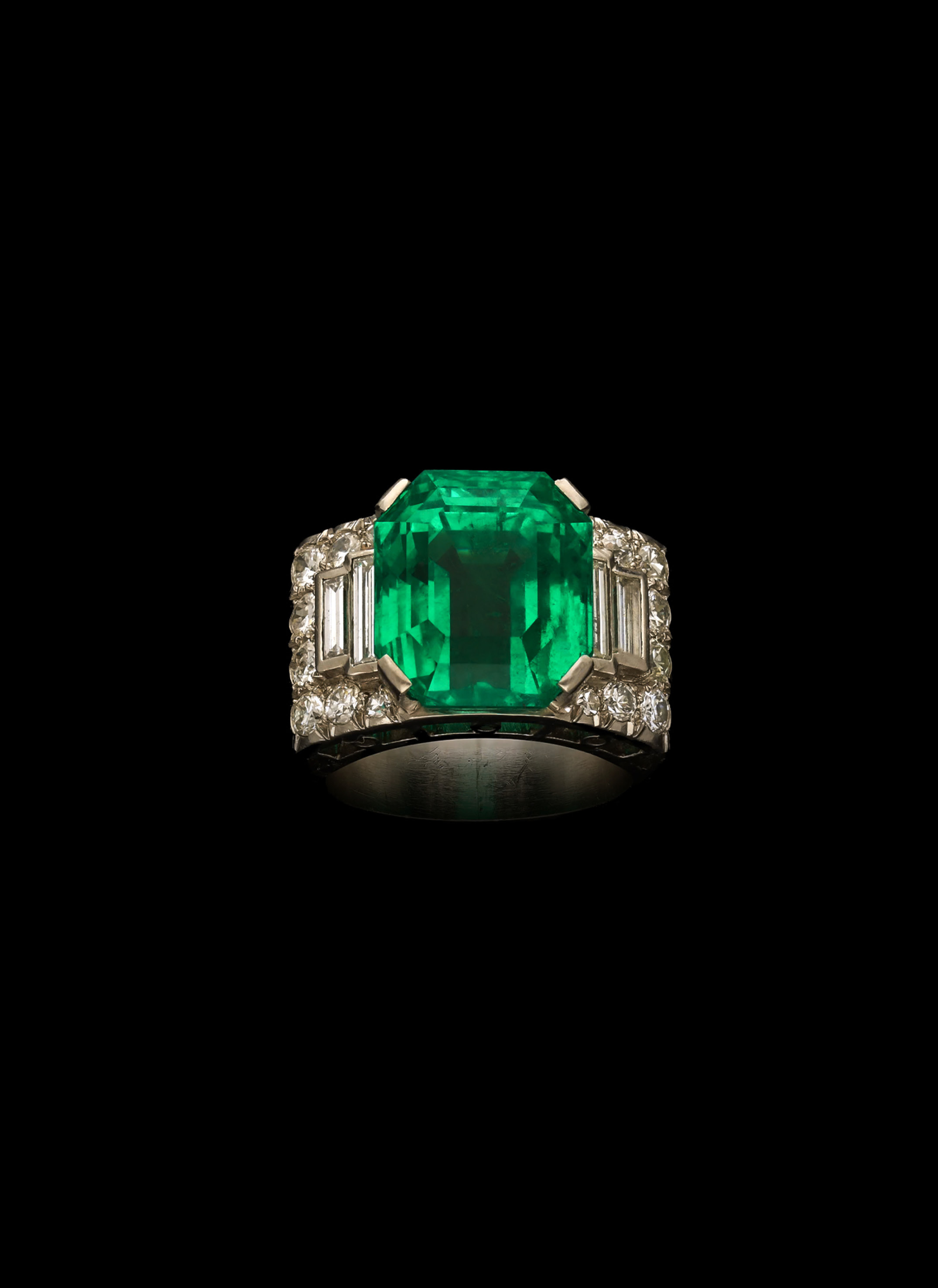 Art Deco emerald & diamond ring, circa 1920-1930 Platinum, emerald and diamond Provenance: New York collection An Art Deco emerald & diamond ring, set with a step cut Colombian emerald weighing 10.87 carats flanked by baguette shaped & old mine cut diamonds. The emerald has a deep colour and is minor oil. Estimated total diamond weight is approximately 1.55 carats. Estimated colour E-G on average. Estimated clarity VVS-VS on average. The diamonds are bright & lively. Mounted in platinum. Accompanied by a SSEF certificate for the emerald.