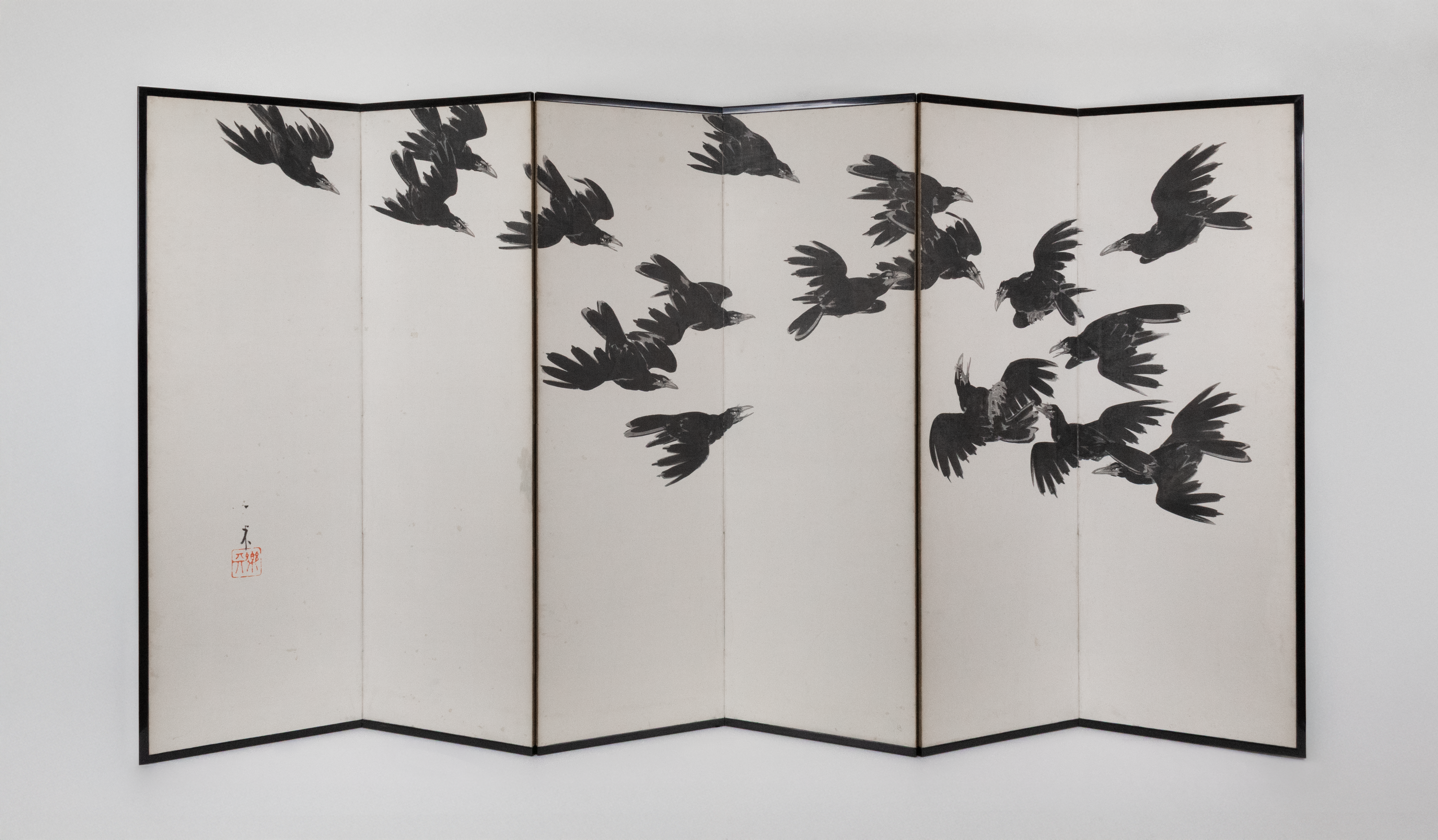 Nagai Ikka (Japan, 1869–1940) Pair of six-panel folding screens with crows, 1930s Ink on paper H 137 x W 268 cm (each) Signed in the bottom corner Provenance: private collection, Japan Nagai Ikka (also known by the art names Zuiunan and Hanpo) was born in 1869 in Suibara, Niigata Prefecture, during the early Meiji period. He trained under leading masters of the Maruyama and Shijō schools, including Suzuki Shōnen, Nakano Kimei, and Hirafuku Hoan, and later absorbed stylistic influences from Kawanabe Kyōsai. This grounding in careful observation and naturalistic rendering provided the foundation for a personal style that balanced precision with expressive freedom. He began painting crow paintings after helping Ernest Francisco Fenollosa create 'One Hundred Crows', a painting he had commissioned from Kyosai. The late Meiji and Taishō periods were marked by profound change in Japanese art, as artists navigated between traditional aesthetics and the growing influence of Western naturalism. Ikka embraced this dialogue, drawing on classical ink painting techniques whilst expanding his horizons abroad. From 1903 to 1908, he lived in the United States, exhibiting at international events such as the Portland Expo, where he won a silver medal, and later at the Italian Expo. His crow paintings, admired both in Japan and overseas, earned him the affectionate nickname 'Doctor of Crows' from statesman Ōkuma Shigenobu. The crow (karasu) has a long symbolic tradition in Japanese culture, appearing in classical poetry, Buddhist imagery, and Shintō cosmology, most famously as Yatagarasu, the mythical three-legged crow. Ikka revitalised this motif, transforming it from a minor decorative element into the central subject of bold, dynamic compositions. This pair of six-panel folding screens demonstrates his command of movement and atmosphere. Painted in ink with sparing touches of colour, the crows appear in varied postures—perched, in flight, or interacting—creating a rhythm that guides the viewer’s eye across the expansive surface. Bold, calligraphic brushstrokes define wings and feathers, while softer washes evoke wind, mist, and shifting light. The result is a scene that is both naturalistic and poetic, combining the restraint of traditional ink painting with a striking modern vitality. Ikka’s crows are not static symbols but living presences, conveying alertness, intelligence, and social energy. His lifelong study of corvid behavior, informed by travels across Japan, Korea, China, Taiwan, and the United States, gave his work an observational depth rare among his contemporaries. At the same time, his art reflects a broader ambition: to elevate the ordinary into the emblematic, merging natural accuracy with expressive force. Today, Ikka’s crow paintings are prized by collectors and studied as important examples of Meiji-period nihonga, where fidelity to nature combines with enduring Japanese aesthetic ideals. These folding screens stand as a testament to his originality and his ability to transform a humble subject into a powerful symbol of vitality and freedom.