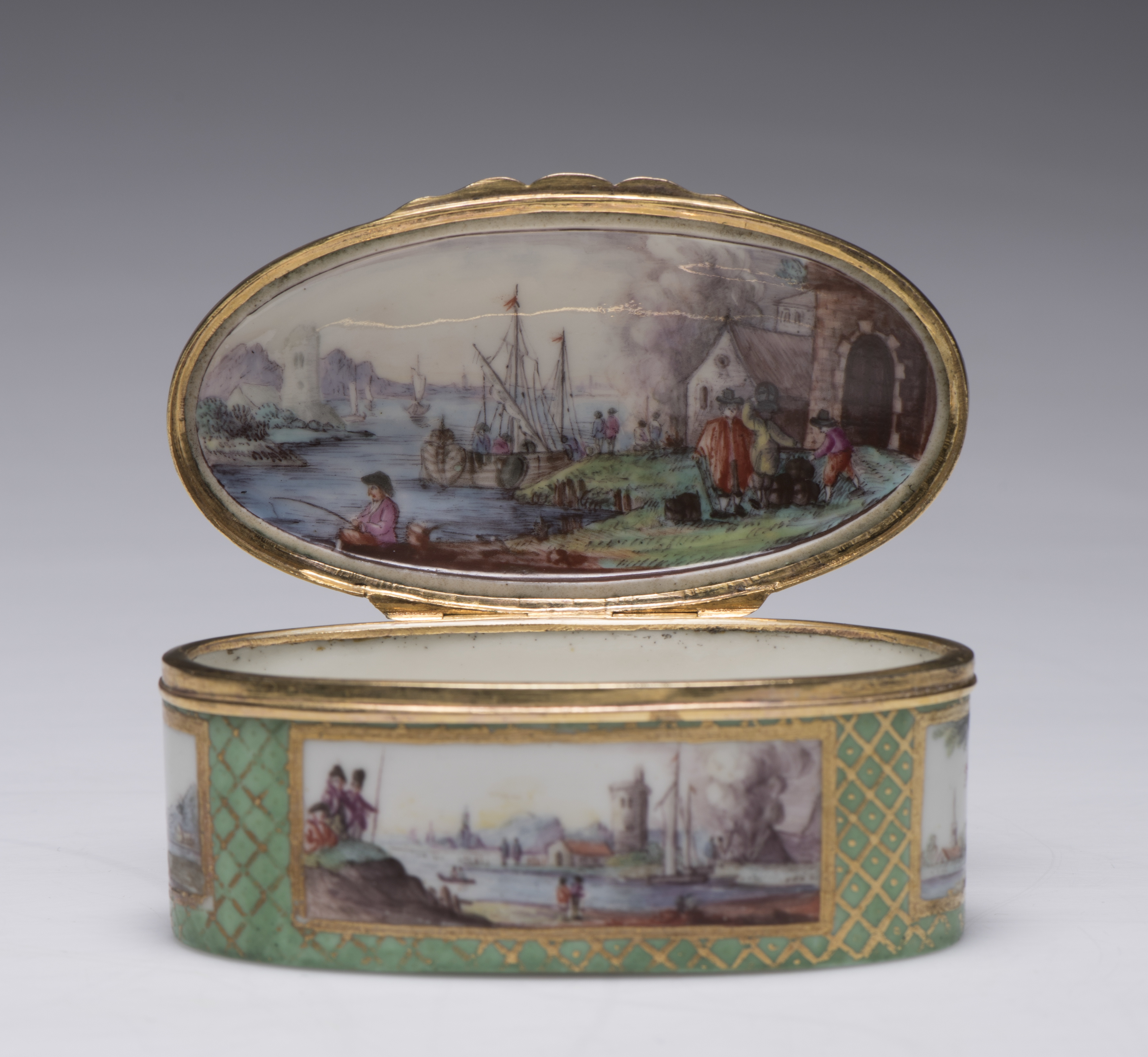 Boîte (tabatière) en porcelaine décorée par Georg Christoph Lindemann à la manufacture de Tervuren sur un blanc de porcelaine de Tournai. Vers 1775.