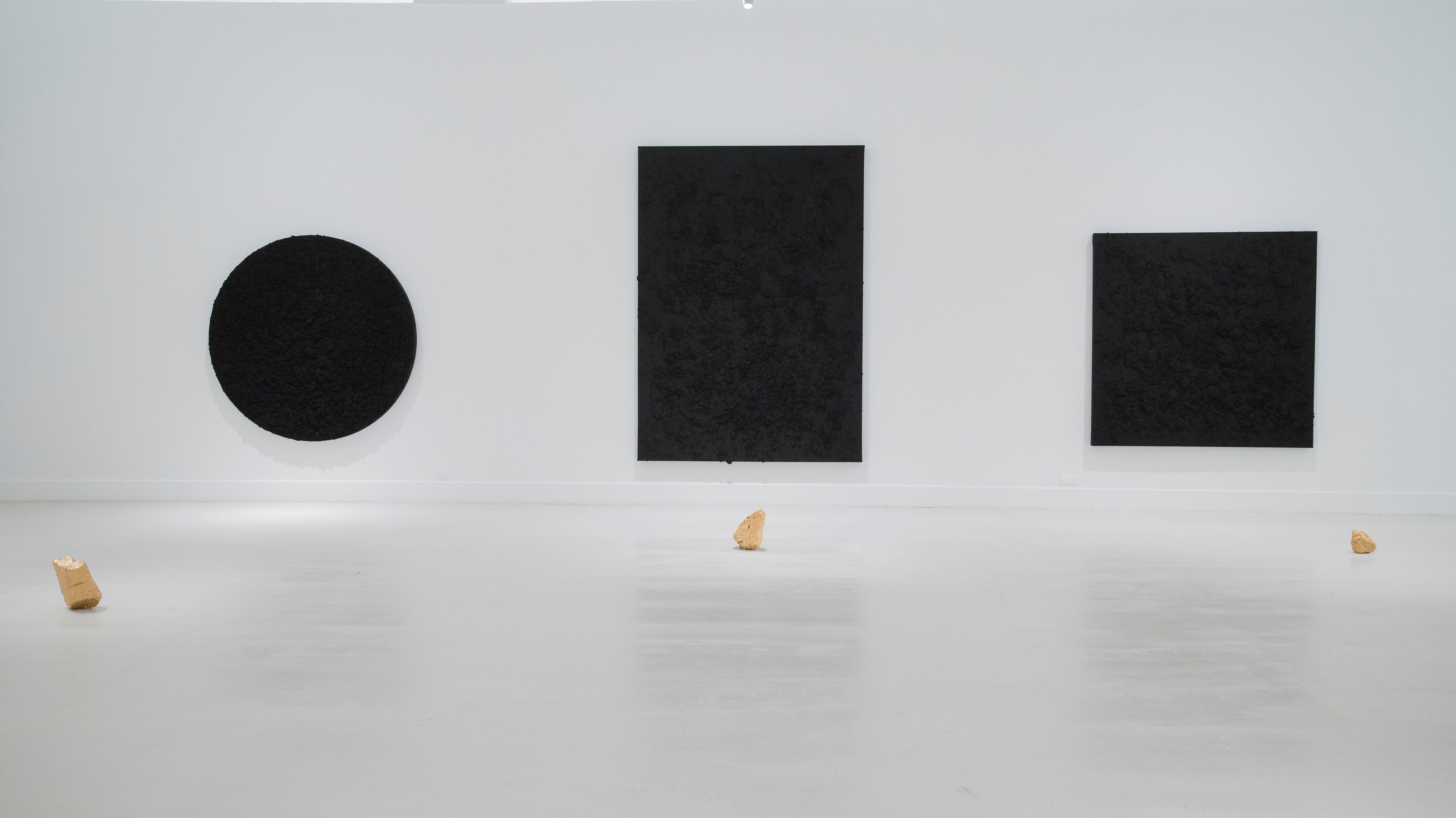 Axel Vervoordt Gallery is pleased to announce the opening of “Into the Deepest”, a new solo show by Bosco Sodi. The exhibition presents a selection of black monochrome paintings with abundant textures and various geometric shapes, together with several sculptures of golden rocks. The elements used are characterised by being untreated natural materials such as pigments, sawdust, wood, pulp, natural fibers, or resins.
