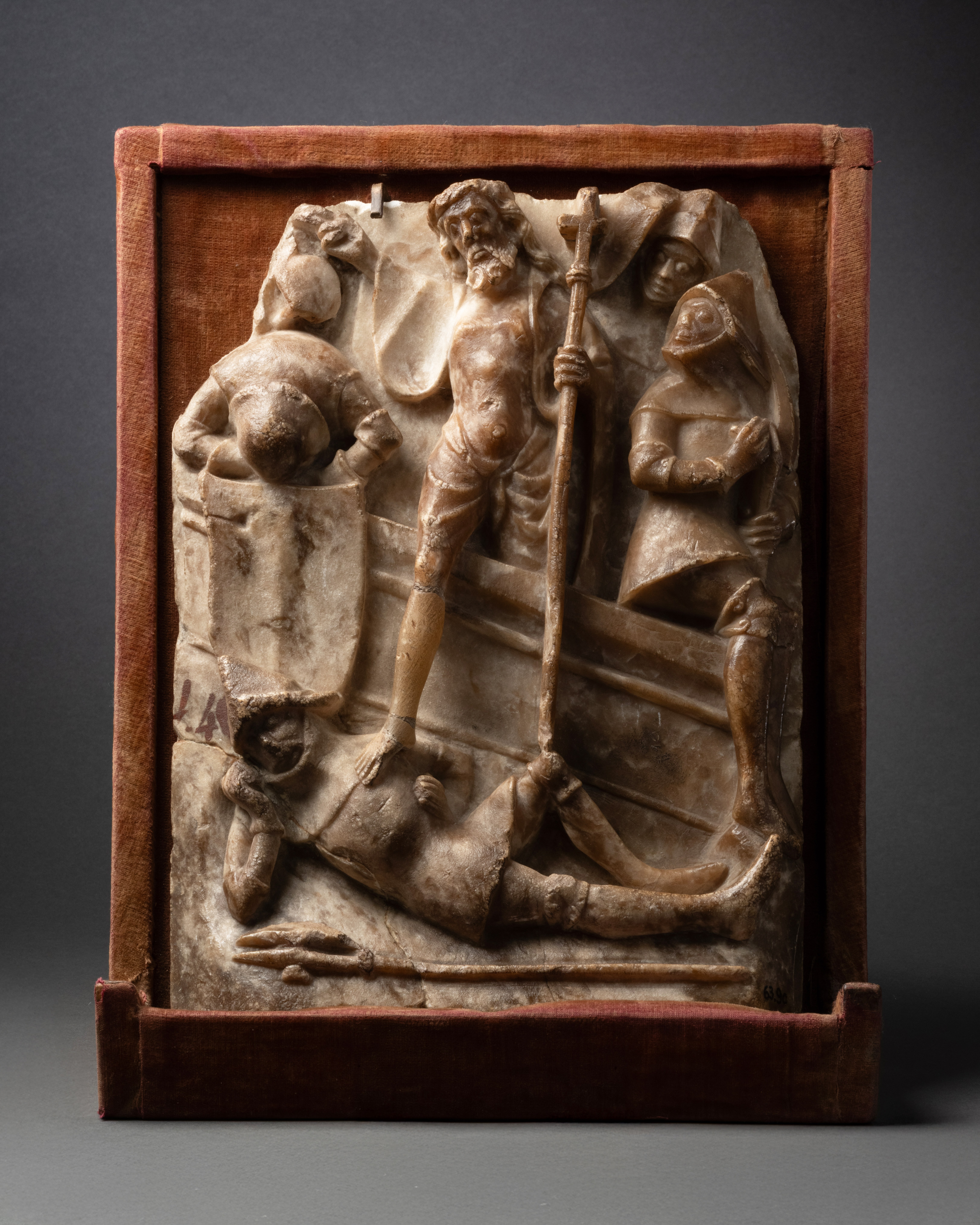 Christ rises triumphantly from the tomb, his figure softly modelled with the luminous warmth unique to English alabaster. At his feet, soldiers lie sleeping, their armour and expressions carved with remarkable precision.
