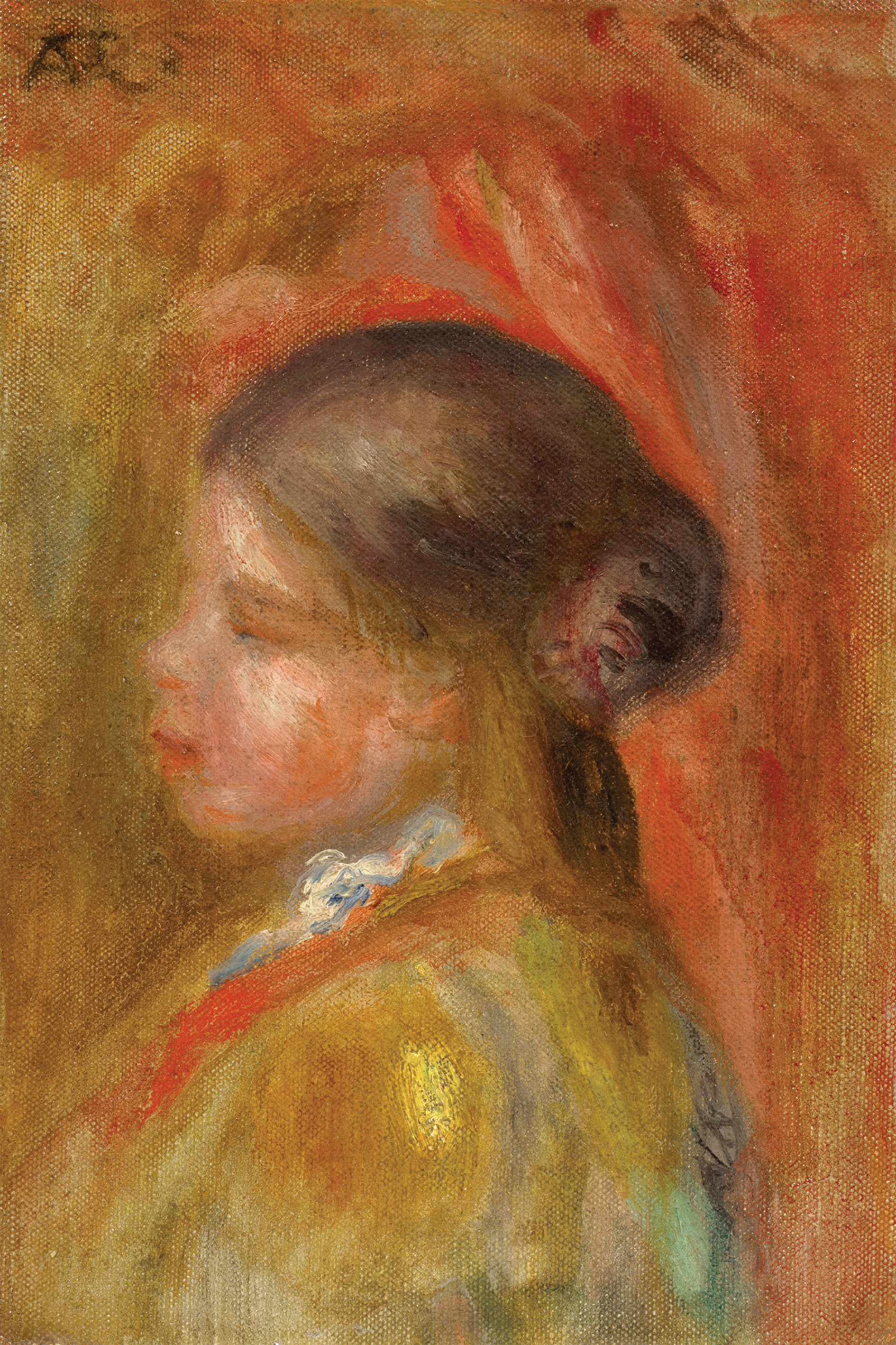 "Head of a Woman" (1895) de Renoir marque un retour à une conception classique du portrait. Dimensions: 24.2 x 16.4 cm, signé avec un tampon. S'inscrit dans une tradition de portrait Renaissance, mettant l'accent sur la forme et la couleur. Inclus dans le catalogue raisonné en préparation par le Wildenstein Plattner Institute.