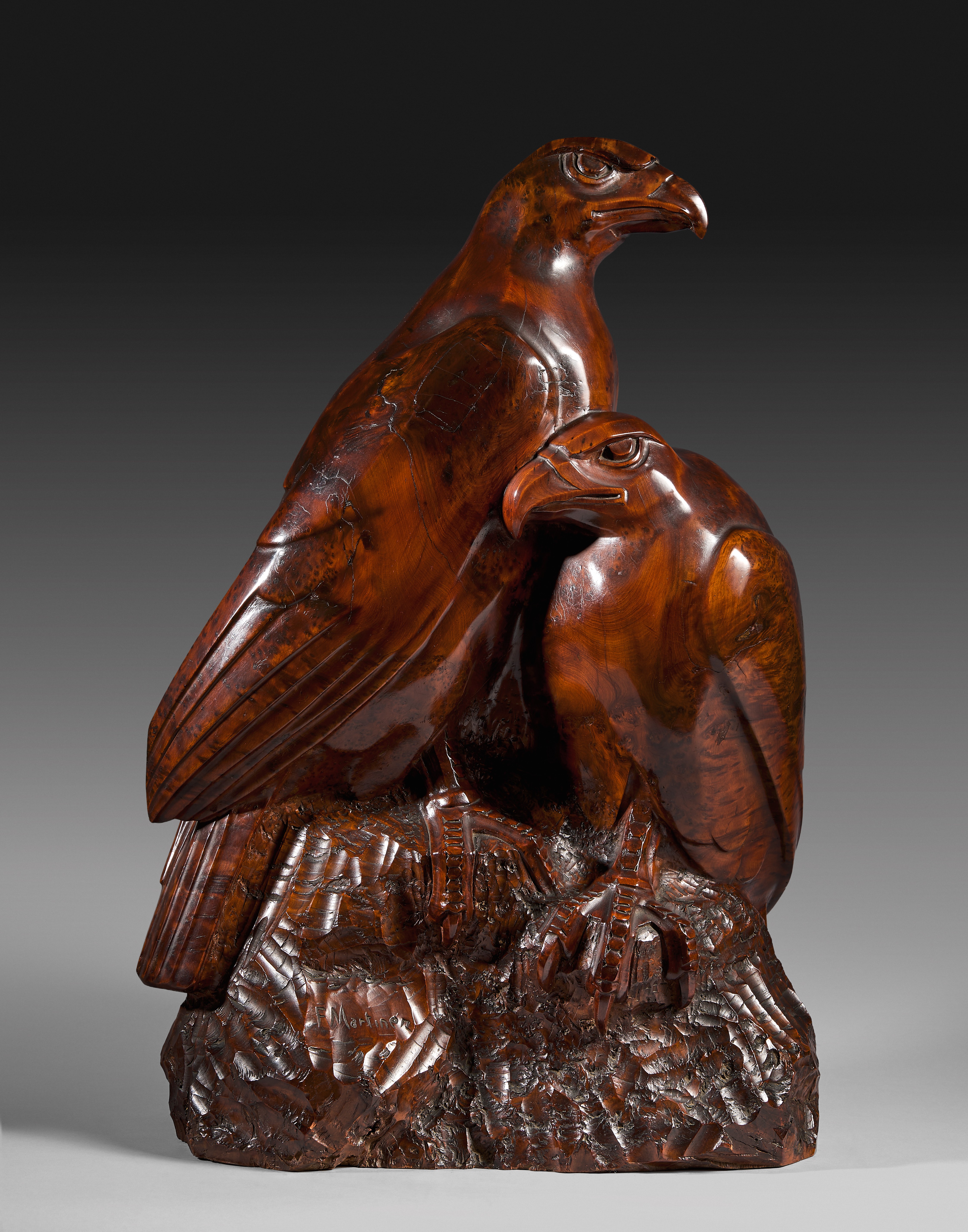 François Martinez (Oran 1902–1986 Toulouse), Two Birds of Prey, Circa before 1938, direct carving in thuja wood, H 57 x W 39 x D 26 cm, signed ‘F Martinez’, Unique piece