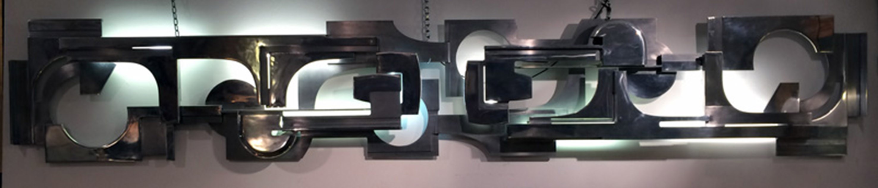 Line Vautrin (Paris, 1913-1997) Crète de coq mirror, circa 1965 Talosel inlaid with mirror fragments H 50 x W 41.5 cm Diameter at sight of the central witch: 10 cm This work is accompanied by a certificate of authenticity issued by the Line Vautrin Committee “Crète de Coq”, mirror in black Talosel inlaid with mirror fragments, by Line Vautrin. This convex “witch mirror” features a radiant decoration of incised Talosel inlaid with polychrome mirror tesserae in shades of red, gold, copper, and silver. The spiral composition evokes the bristling energy and dynamic movement of a cockscomb, its form at once organic and architectural. A rare and technically demanding creation, Crète de Coq exemplifies Vautrin’s experimental mastery of Talosel - a material she both discovered and transformed into a medium of pure artistic expression. In this piece, she chose a warm palette of reds, oranges, golden ambers, and bronzed tones, creating a striking contrast with the deep black of the Talosel structure. The frame itself unfolds in six spiraling curves, each extending into a series of radiant, gently curved points that seem to shimmer and vibrate with light. Singular within her oeuvre, this asymmetrical spiral composition differs from Vautrin’s more familiar series, revealing her ability to reinvent form and rhythm through subtle variations. Crète de Coq is not merely a mirror, but a luminous, poetic sculpture - an enchanting testament to Line Vautrin’s imagination and her genius for turning humble materials into magical, living art.