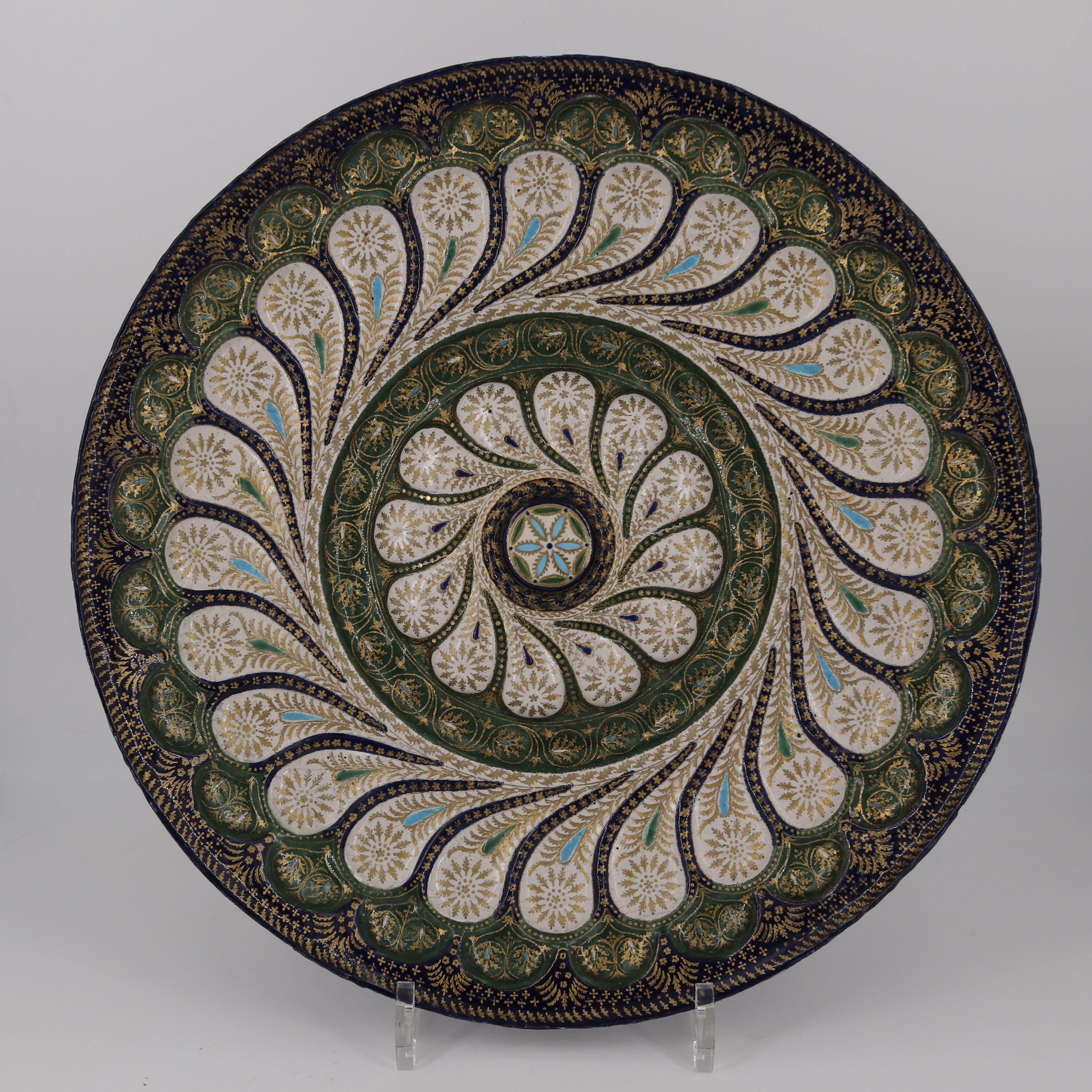 Workshop of Benedetto da Maiano (Maiano 1442-1497 Florence) Bas-relief of the Virgin and Child with Saint John the Baptist as a child Polychrome and gilded stucco in its original carved and gilded wooden frame H 76 x W 64 x D 13 cm (framed) Provenance: Coat of arms with the alliance arms of two Florentine families: the Compagni (on the left) and the Tornaquinci (on the right) We can estimate that around thirty copies of this bas-relief were probably made, half of which are in public collections (including the Bode Museum in Berlin (Germany – Inv. 1581), the Victoria & Albert Museum in London (United Kingdom – two copies), the Bargello and Stefano Bardini Museums in Florence (Italy), and the Hermitage Museum in Saint Petersburg (Russia) but this one is the only one bearing the coat of arms of its commissioners.