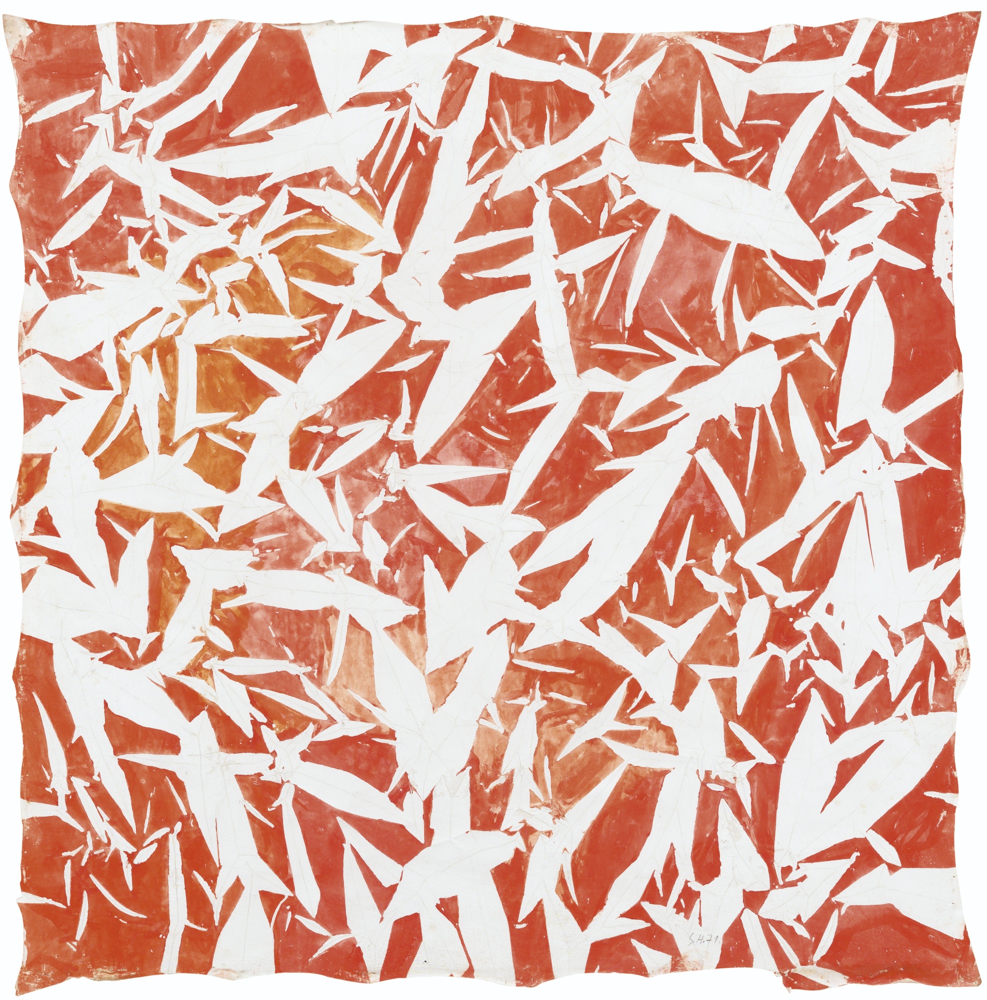 Deze studie maakt deel uit van een reeks werken die Simon Hantaï in 1968 is begonnen en die voor het eerst in juni 1969 bij Jean Fournier tentoongesteld werden. Een gefragmenteerd beeld van een oranjerode kleur die doorkliefd wordt door een fel wit. Rond de overgang naar de jaren 60 voerde de kunstenaar onderzoek uit naar de vouwmethode. Dit werk is hiervan een prachtig voorbeeld.