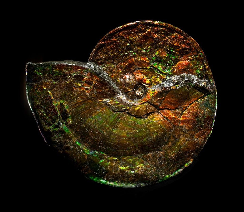 Ammonite is a palaeontological term applied to a group of extinct marine cephalopods- squid-like organisms with disk-shaped coiled shells that are divided internally into chambers that were particularly abundant during the Jurassic and Cretaceous periods (about 200 to 65 million years ago). This brightly coloured ammonite, considered an organic gemstone fossil, was obtained from the Bearpaw Formation which is a geologic formation of Late Cretaceous (Campanian) age. It outcrops in the U.S. state of Montana, as well as the Canadian provinces of Alberta and Saskatchewan, and was named for the Bear Paw Mountains in Montana. These complete ammonites are amongst some of the most sought-after fossils in the world. Known for their rarity and vibrant colours finding specimens of this scale are few and far between. The opal like iridescence on the outer shell is a unique and beguiling effect caused by light interference and diffraction through lots of fossilised shell layers. Prismatic colours of red, green, blue, orange and purple reflect light from every angle, this chromatic shift transforms the fossils appearance from one position to another. This remarkable gemstone takes millions of years of compression and mineralization to form.