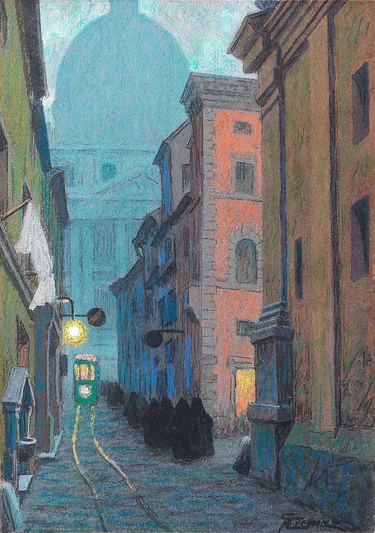 In this atmospheric pastel, Giovanni Battista Crema portrays a corner of the piazza seen from the Borgo Vecchio looking towards St. Peter's Square; the piazza is immersed in the shadow of dusk as a tram heads towards us with its headlights shining, and a group of nuns makes its way towards the basilica looming in the background.