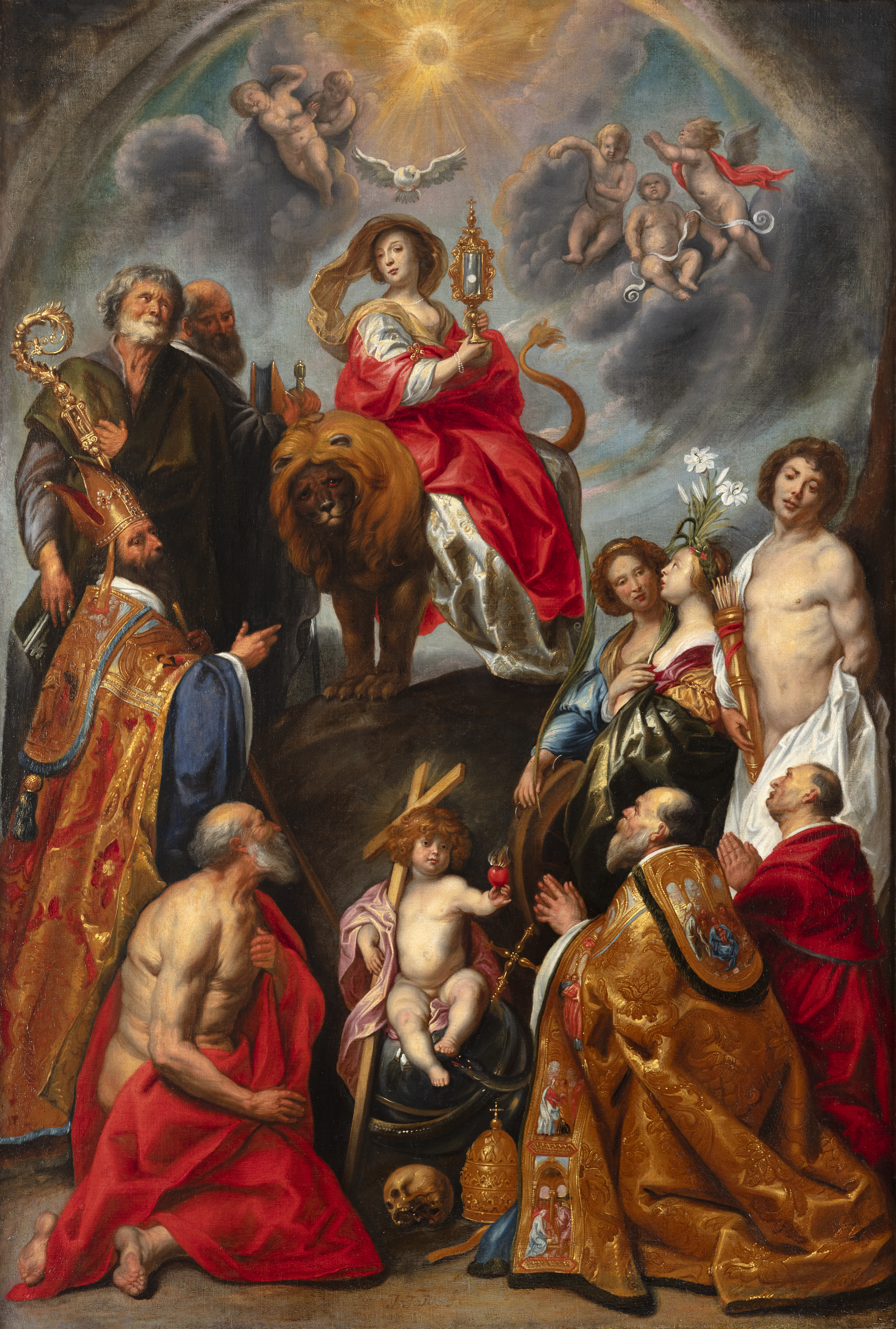 Jacob Jordaens (1593-1678), The Triumph of the Eucharist, Oil on canvas,120 x 81 cm, Signed with monogram central below: “J. Jor. Fe.” Preparatory model for the work held at the National Gallery of Ireland. Provenance: Sotheby’s New York, 1992; Spanish private collection